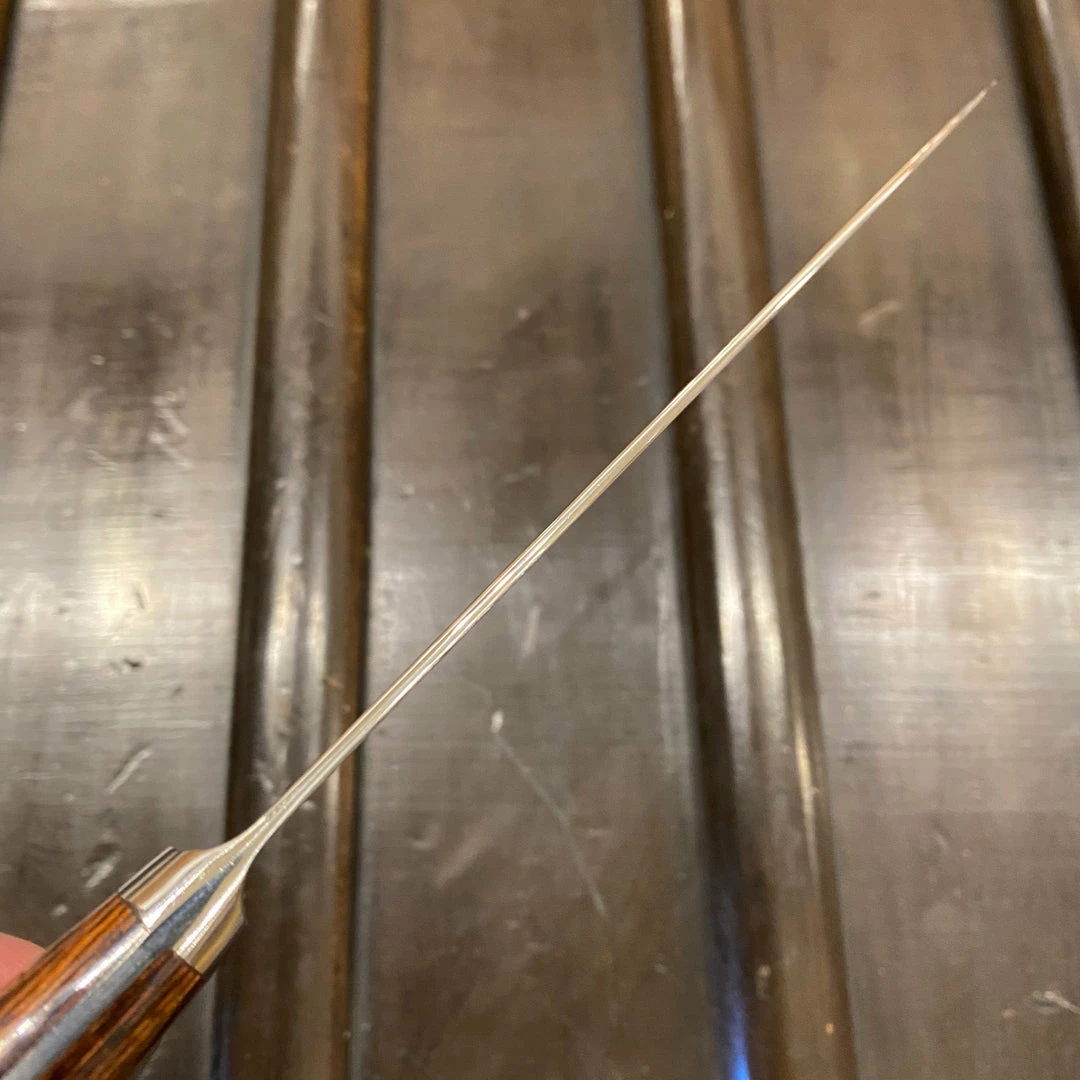 .Monosteel Kanto styleย petty made with a finely finished proprietary stainless steel and imitation mahogony pakka composite wood western handle.