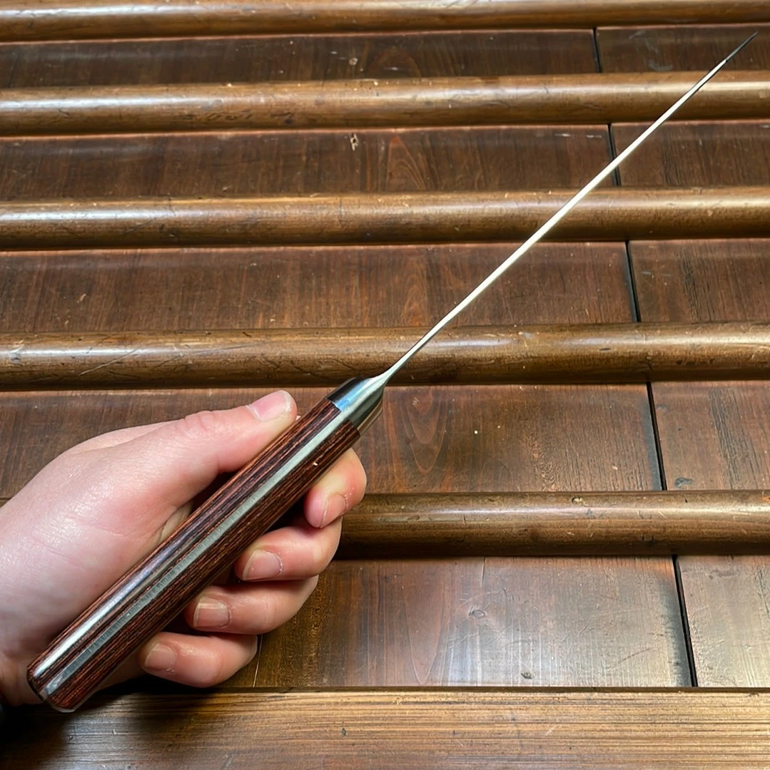 Monosteel Kanto style bunka made with a finely finished proprietary stainless steel and imitation mahogony pakka composite wood western handle.