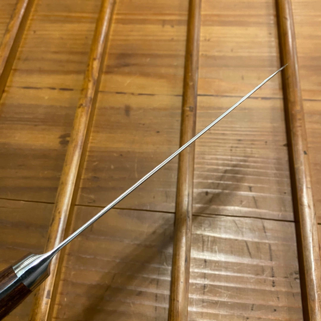 Monosteel Kanto style santoku made with a finely finished proprietary stainless steel and imitation mahogony pakka composite wood western handle.