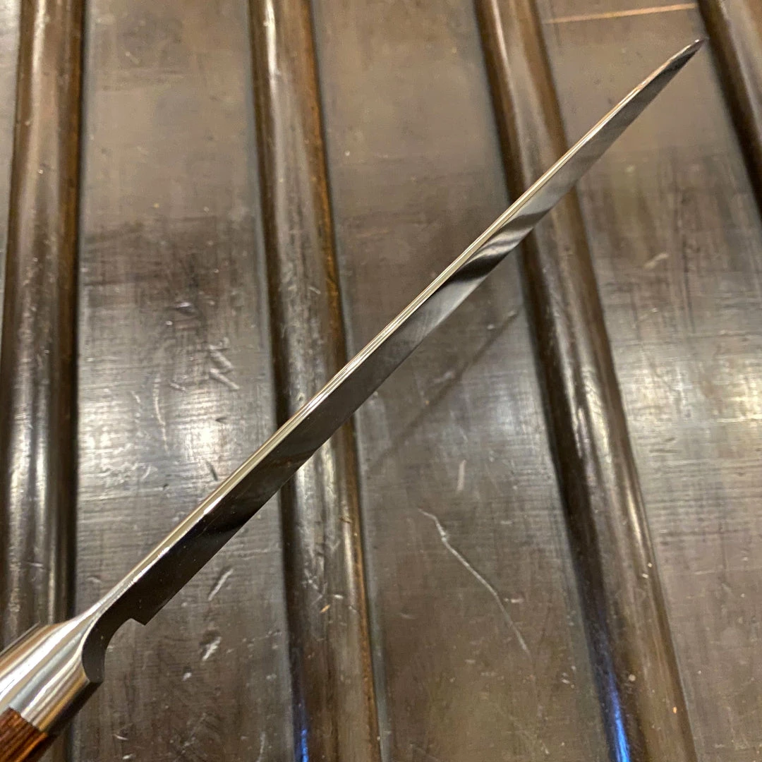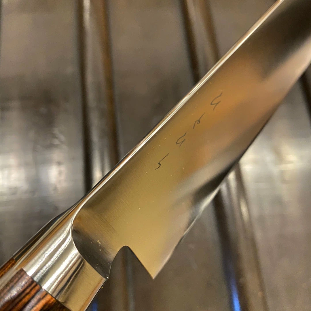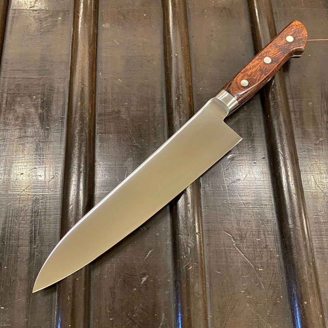 Monosteel Kanto style Gyuto made with a finely finished proprietary stainless steel and imitation mahogony pakka composite wood western handle.
