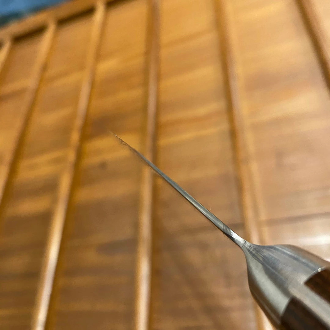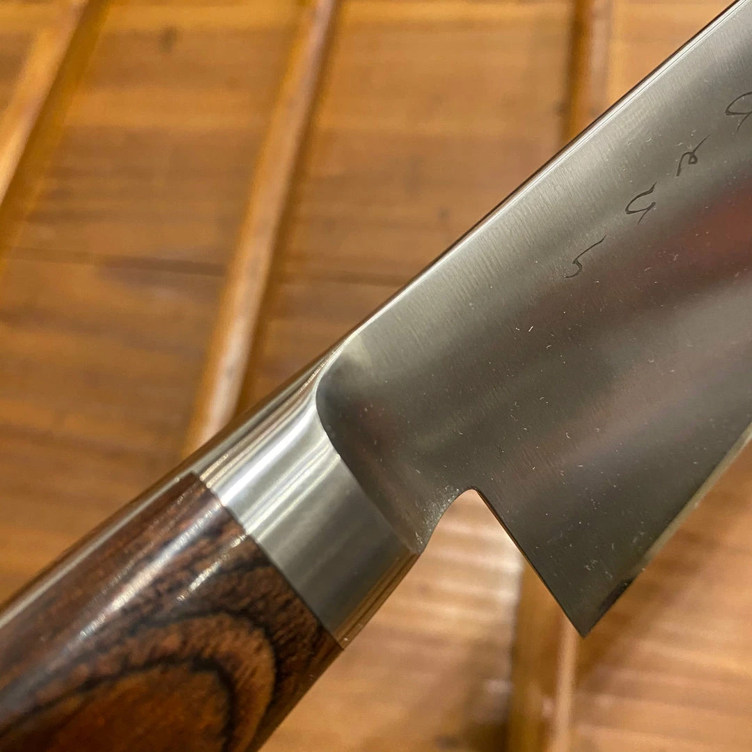 Monosteel Kanto styleย petty made with a finely finished proprietary stainless steel and imitation mahogony pakka composite wood western handle.