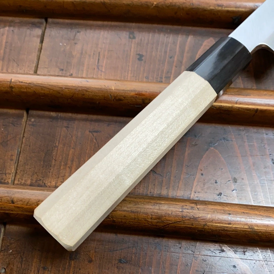 Deep ground ura hollow grind on the inside makes for excellent food release and helps to keep a narrow urasaki throughout the life of the blade and a polished spine and heel are a nice touch.