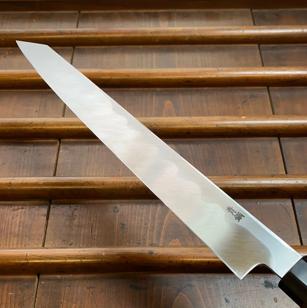Hand forged and ground in Sakai, the Kikuchiyo Manzo series knives from Hitohira represent excellent Sakai craftsmanship. These are characterized by a forging and heat treatment that offers an easy sharpening, good toughness and excellent edge life.