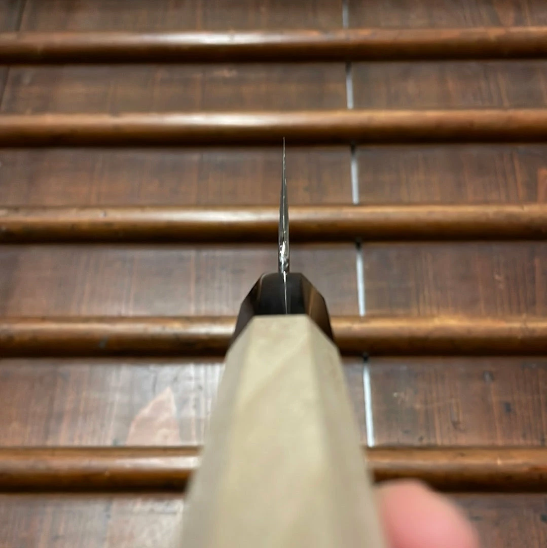 Hand forged in Sakai and ground by a young sharpener in Sakai. These knives come with an impressive lineage with the sharpener’s grandfather being one of a few knife makers who pioneered the wide bevel grinding on double bevel knives.