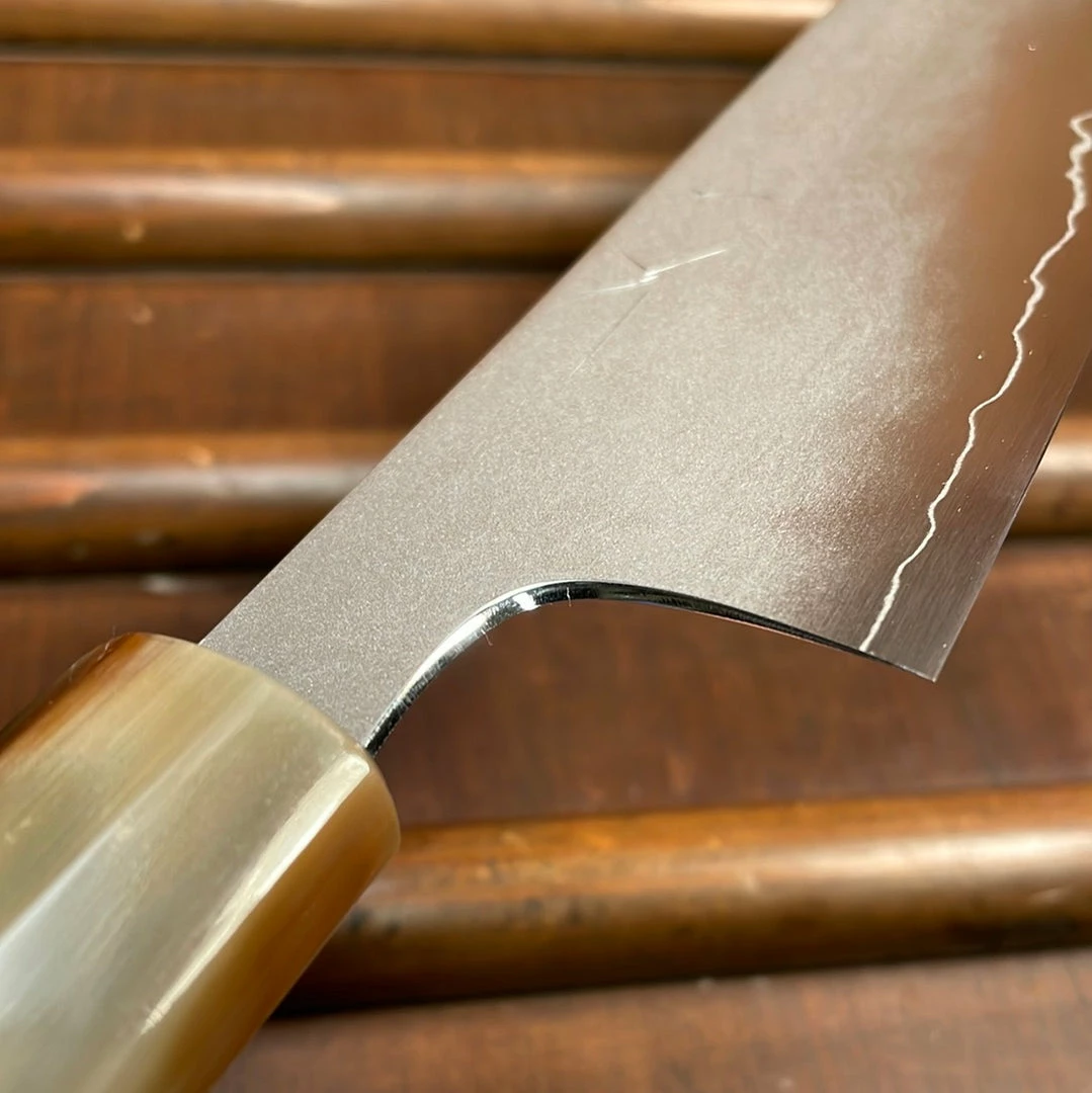 240mm gyuto in ginsanko stainless steel with a hazy kasumi finish on ebony with blond horn handle.