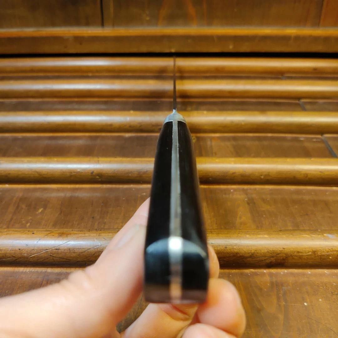 Old style forged SK carbon steelย Sujihiki. We are big fans of thin carbon steel like this, they cut smoothly, sharpen easily and are not terribly delicate if a few basic rules are followed.