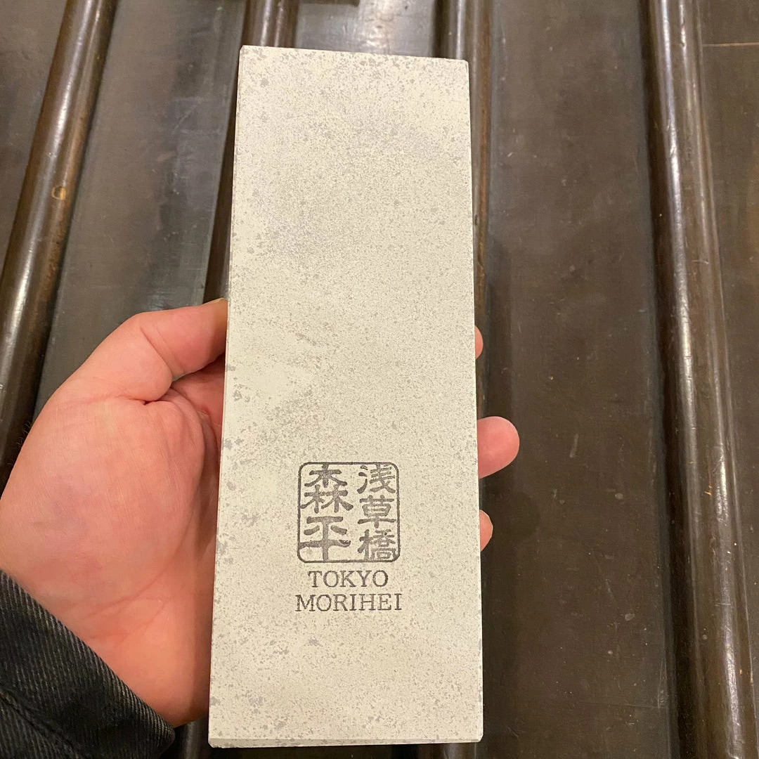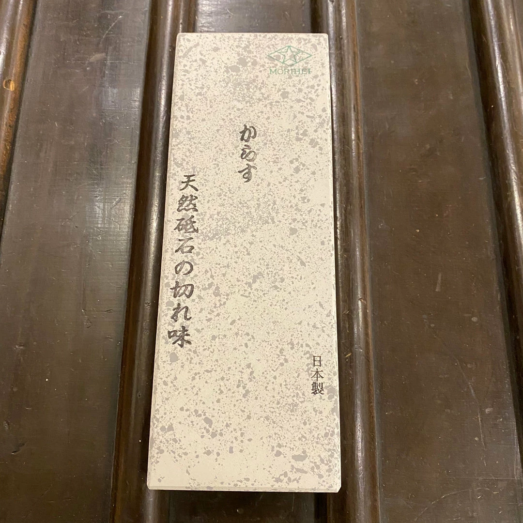 Morihei Hishiboshi 9000 grit Karasu stone is a hazy fine finisher made with natural and man made abrasives formulated for Morihei to his specifications to cut like a natural stone with the consistency of a synthetic. This semi soft stone has an easy going feel, great for wide bevel polishing or narrow double bevel work, it does great in a progression with other Morihei stones. Aside from creating a nice edge these make a beautiful contrast between hard edge forming hagane layer steel and softer jigane cladding. Like a natural stone these are best not soaked although they will not suffer as quickly as a natural from soaking. Just soft enough to generate it’s own mud with sharpening this stone does not require a nagura typically.
