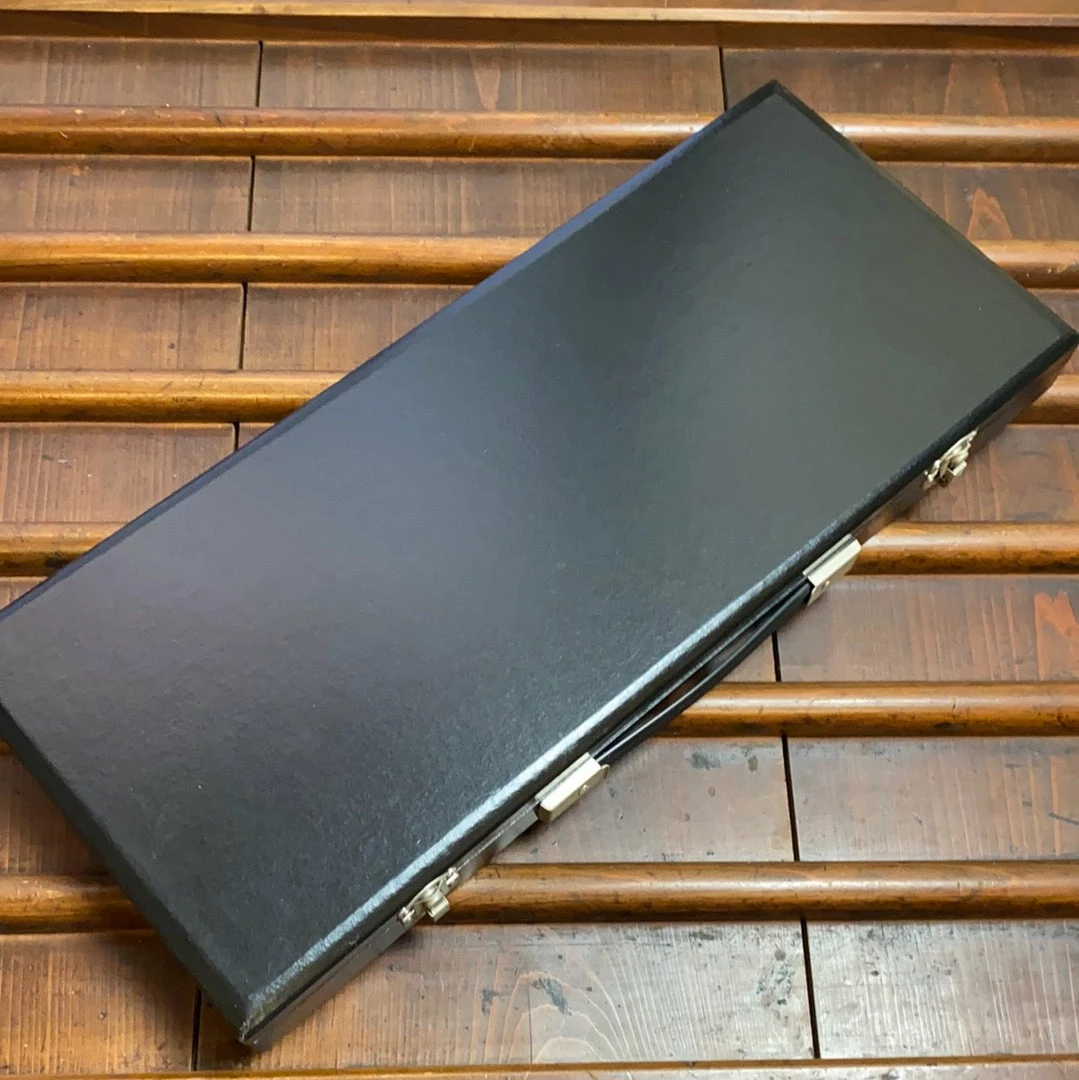 New old stock 270mm stainless menkiri noodle knife made for the Tsubaya knife shop in Tokyo’s Kappabashi kitchen supply district. A double bevel ground san mai steel blade with a bamboo wrapped ho wood handle with guard and hard carrying case.