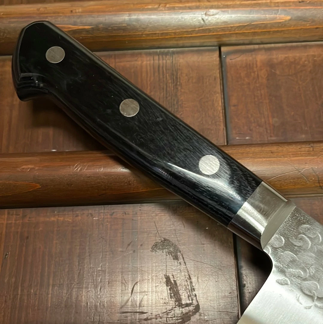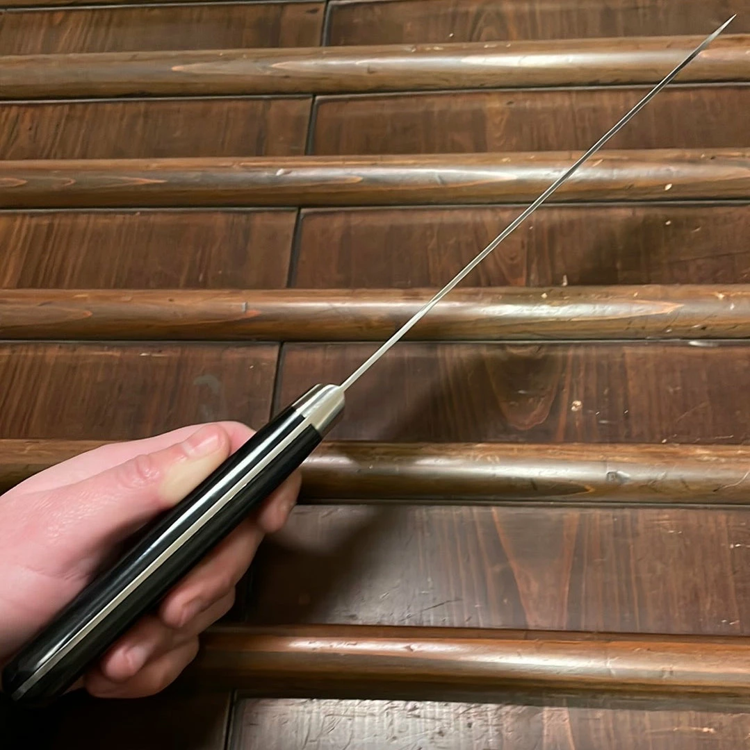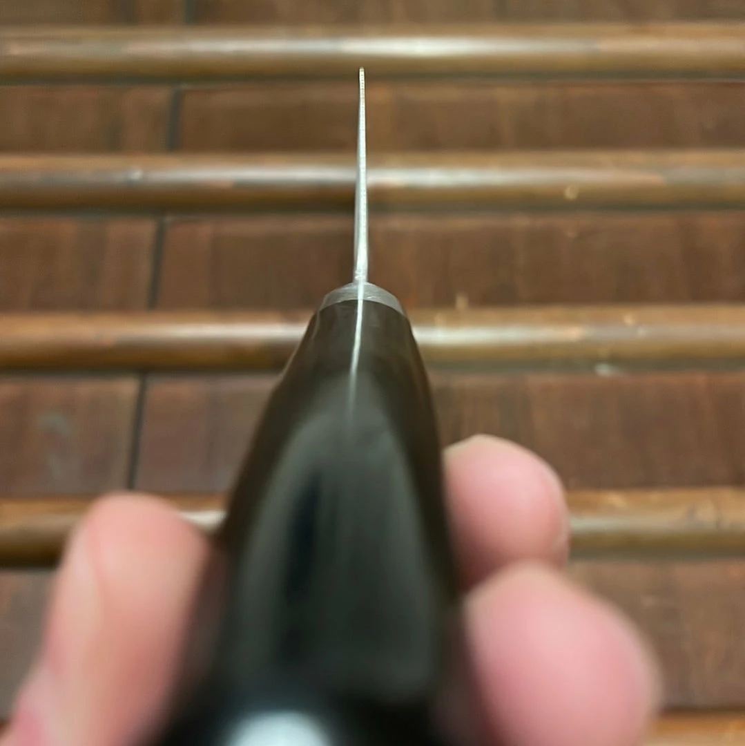 Fine, thin ground stainless clad VG10 stainless steel with a composite pakka wood handle.ย