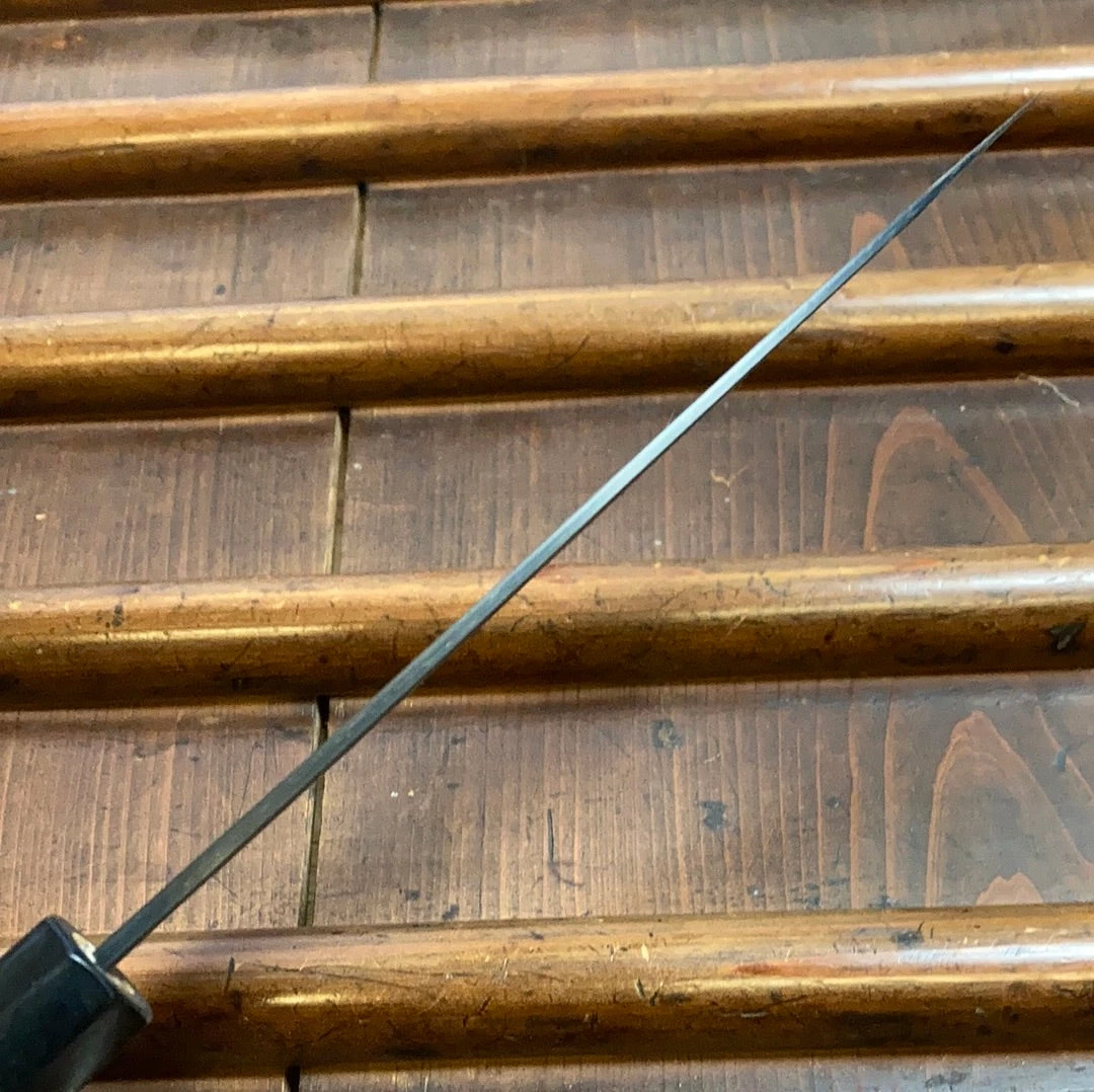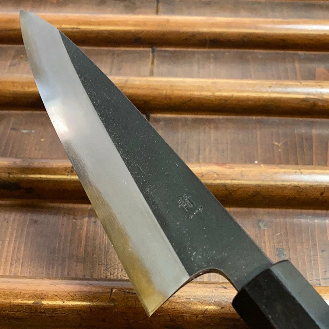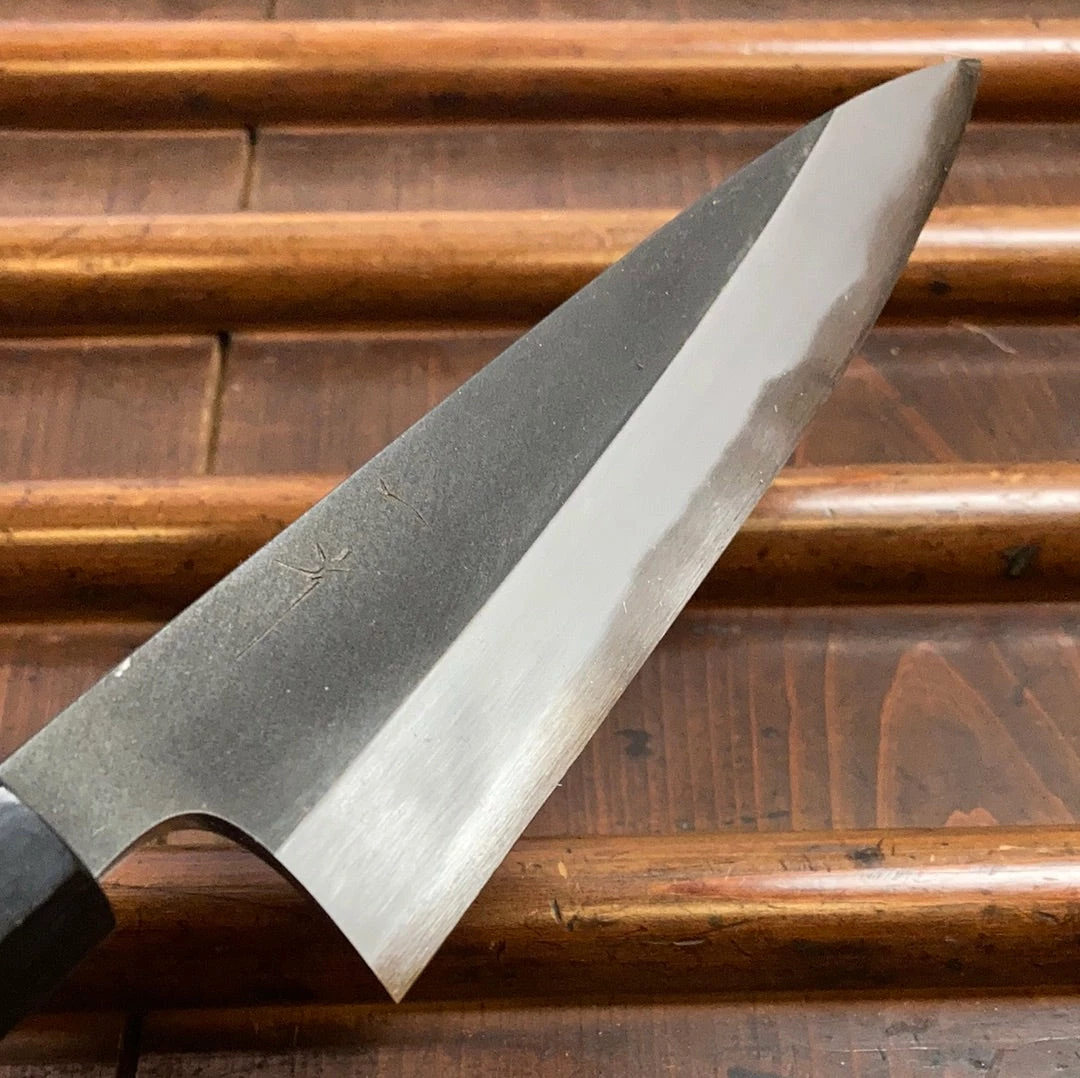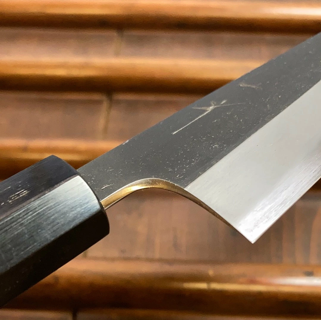 This way of finishing creates the dark and beautiful Kurouchi finish found on this special line. While both types of Kurouchi finishes can fade over time, the etching technique used by sharpener may fade faster.