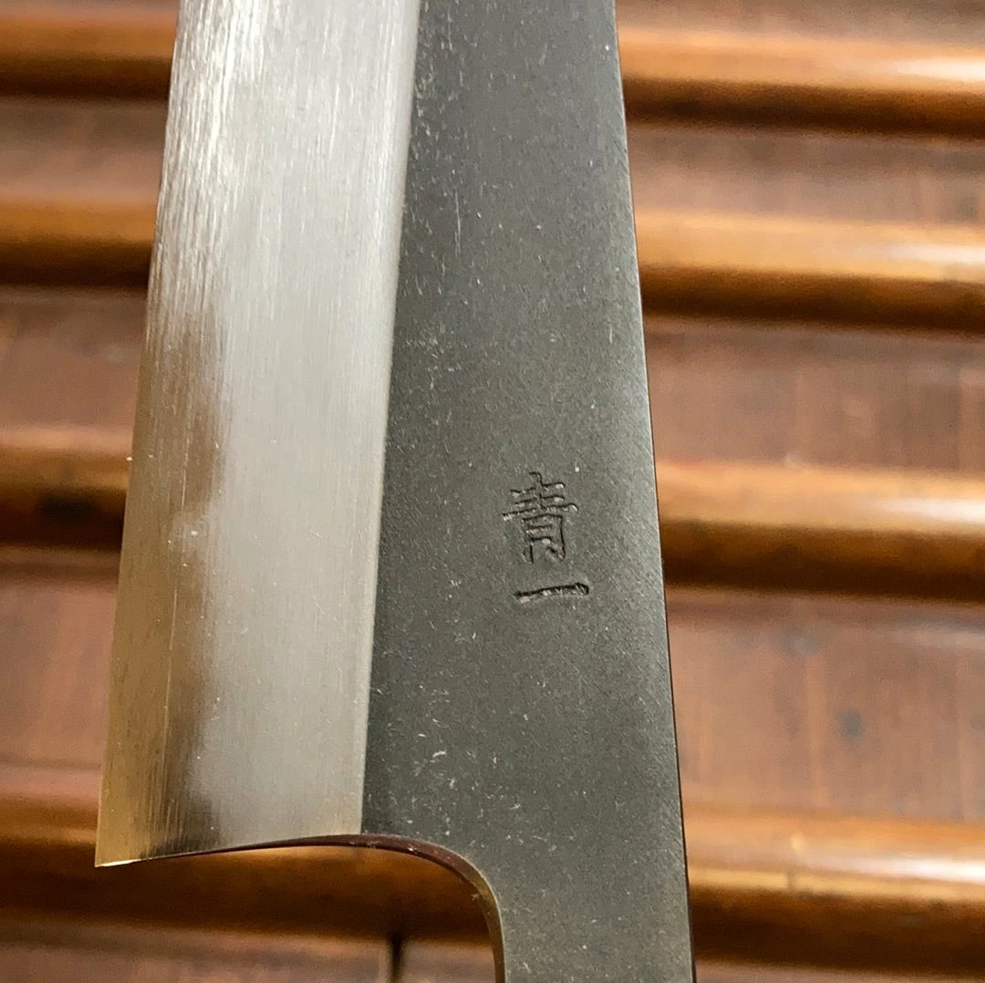 Hand made in Sakai, rustic kurouchi finished iron clad aogami 1 forged by dentoukougeishi master smith Yoshikazu Tanaka and expertly ground by Kyuzo, a sharpener that is very well regarded for his wide double bevel work. Tanaka-sanโs treatment of aogami is very highly regarded, he manages to incorporate both toughness, ease of sharpening with excellent edge formation with long edge life. We have been fans of Tanaka-sanโs for a long time and are very happy to find this collaboration with Hitohira and Kyuzo.ย
