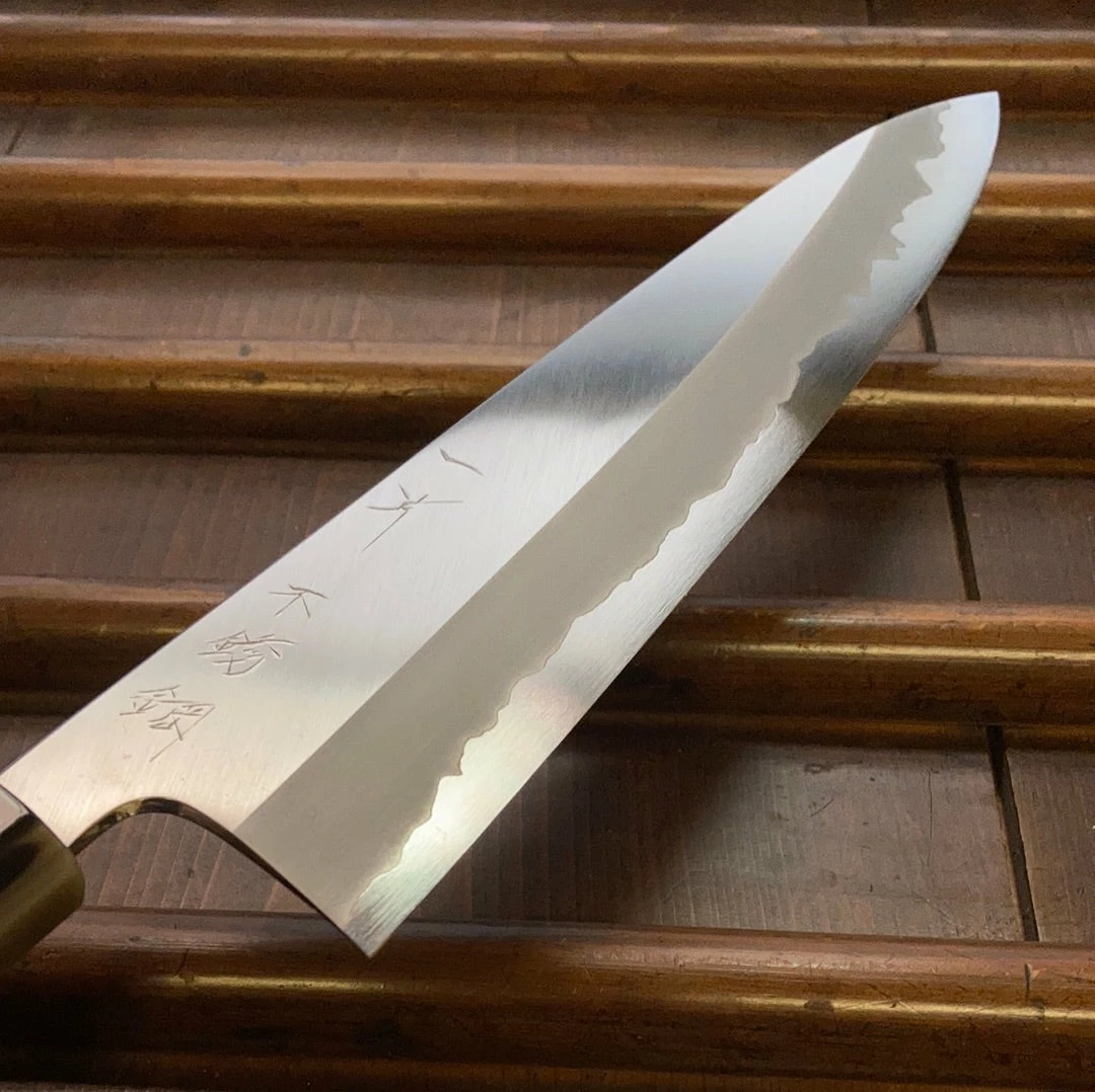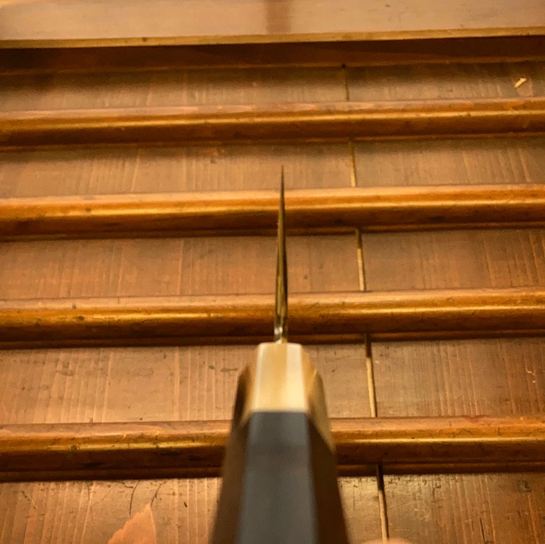 Stainless clad aogami 1 forged by dentoukougeishi master smith Yoshikazu Tanaka whose treatment of aogami is very highly regarded, he manages to incorporate both toughness, ease of sharpening with excellent edge formation with long edge life. Tanaka-san’s top level forging and heat treatments make for an unusual ease of sharpening and superb edge life and toughness. The grinding and finish sharpening are definitely up to par with forging of this quality.