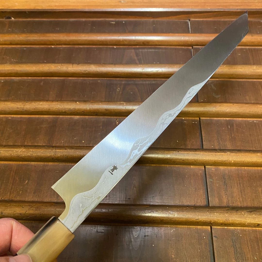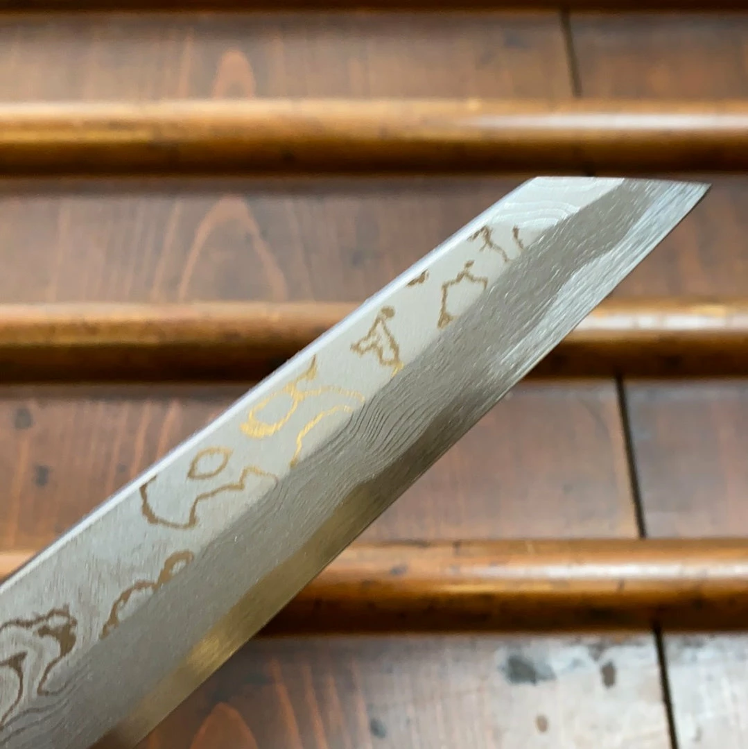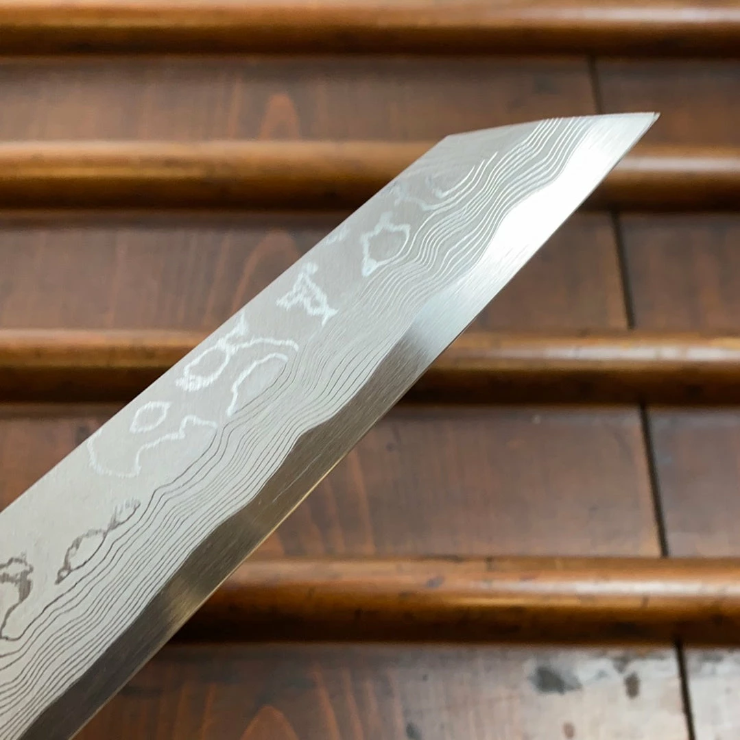 Mild steel and iron suminagashi damascus clad aogami 1 forged by dentoukougeishi master smith Yoshikazu Tanaka whose treatment of aogami is very highly regarded. He manages to incorporate both toughness, ease of sharpening with excellent edge formation with long edge life.ย The grinding and finish sharpening are definitely up to par with forging of this quality.ย