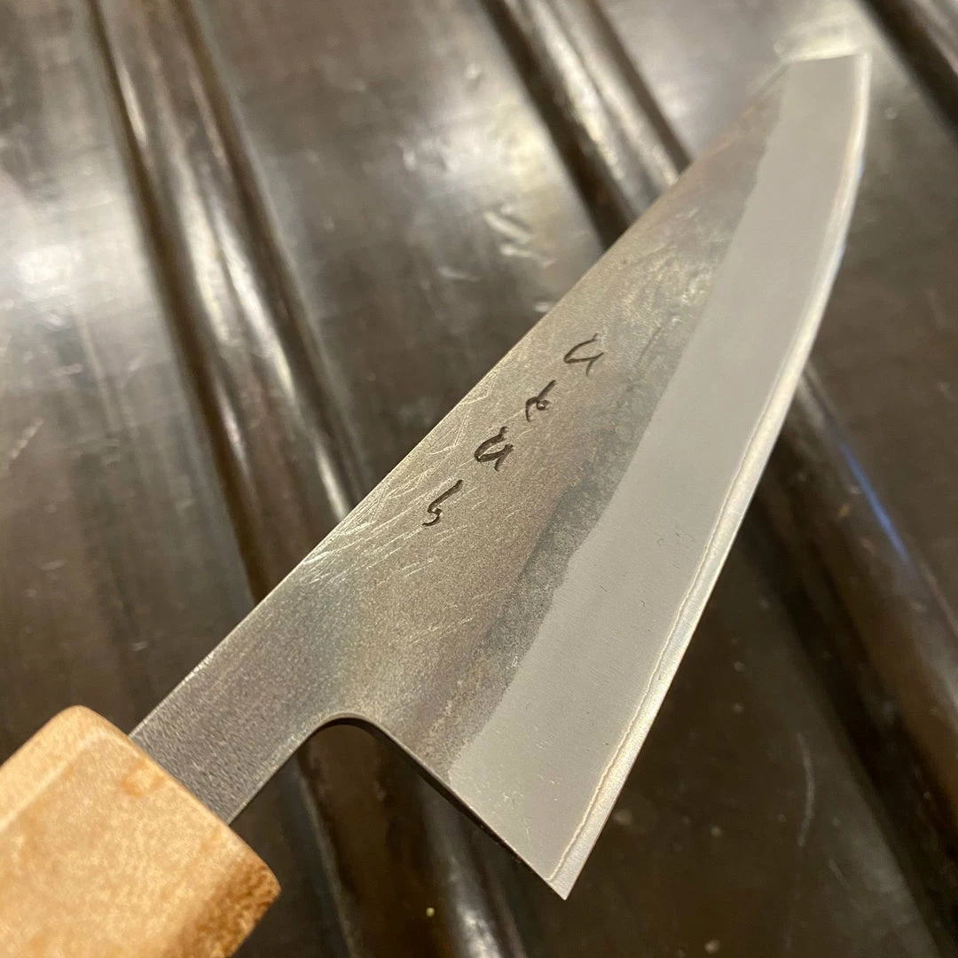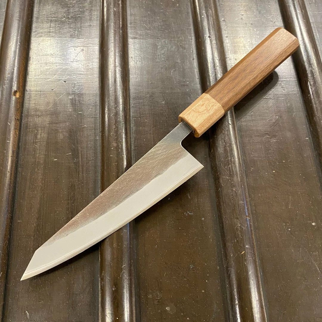 Stainless clad aogami 2 with dark kurouchi finish from forge and subtle geometric hammer marks. Heat treatment offers a nice combination of edge life, and easy sharpening and toughness for a hard high carbon steel. Avoid bones, pits and twisting knife on hard cutting boards though.