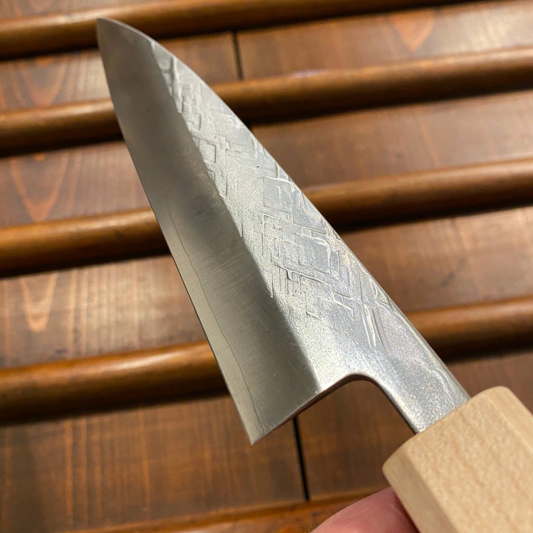 SLD semi-stainless steel core clad with polished subtle geometric hammer marked stainless steel. Heat treatment offers a nice combination of edge life, and easy sharpening and toughness. SLD cuts well as it dulls and maintains a toothy edge for a long time. While not 100% stainless, SLD rusts very slowly and can be maintained almost as easily as stainless without intersecting with reactive ingredients like carbon steel. Avoid bones, pits and twisting knife on hard cutting boards though.ย