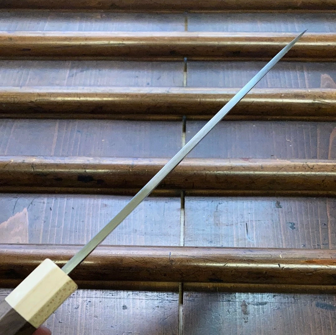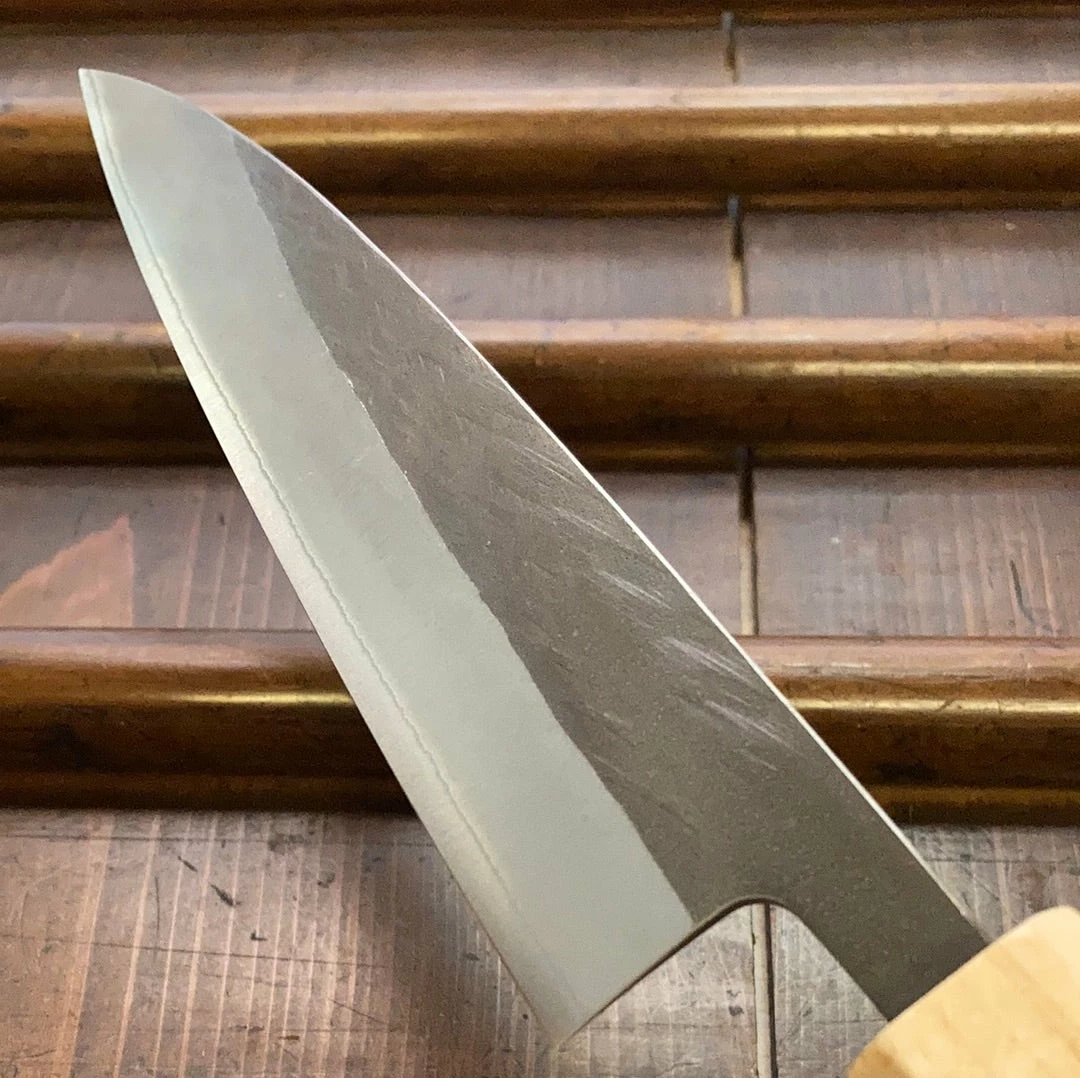 Stainless clad aogami 2 with dark kurouchi finish from forge and subtle geometric hammer marks. Heat treatment offers a nice combination of edge life, and easy sharpening and toughness for a hard high carbon steel. Avoid bones, pits and twisting knife on hard cutting boards though.ย