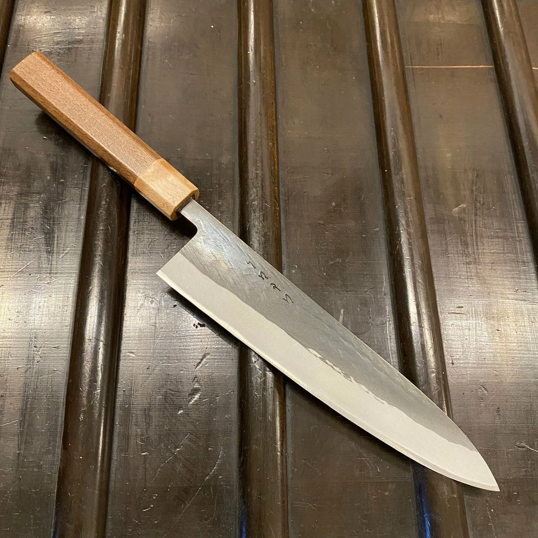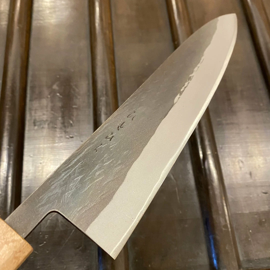 Stainless clad aogami 2 with dark kurouchi finish from forge and subtle geometric hammer marks. Heat treatment offers a nice combination of edge life, and easy sharpening and toughness for a hard high carbon steel. Avoid bones, pits and twisting knife on hard cutting boards though.ย
