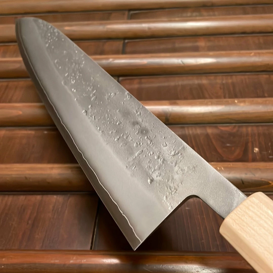 SLD semi-stainless steel core clad with polished subtle geometric hammer marked stainless steel. Heat treatment offers a nice combination of edge life, and easy sharpening and toughness. SLD cuts well as it dulls and maintains a toothy edge for a long time. While not 100% stainless, SLD rusts very slowly and can be maintained almost as easily as stainless without intersecting with reactive ingredients like carbon steel. Avoid bones, pits and twisting knife on hard cutting boards though