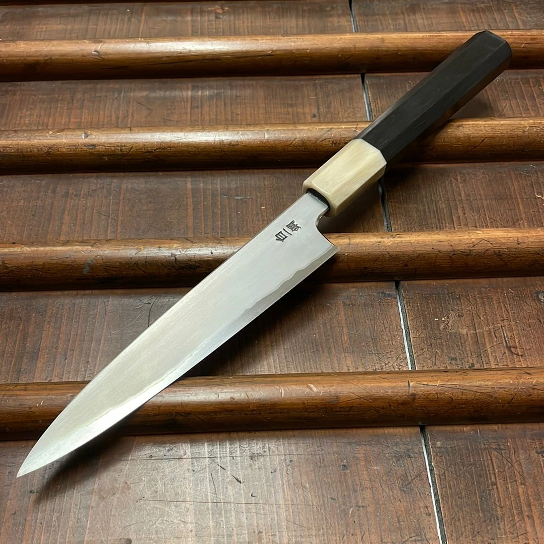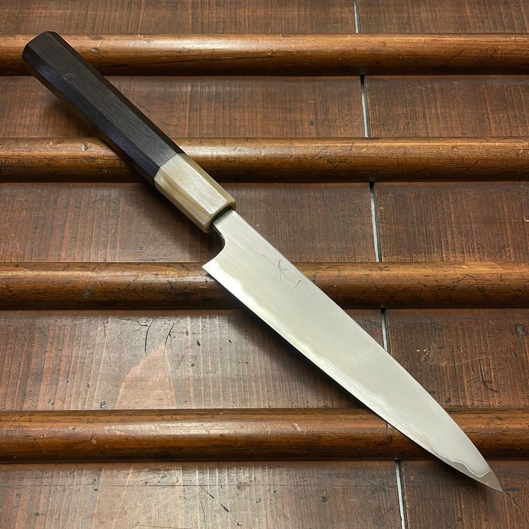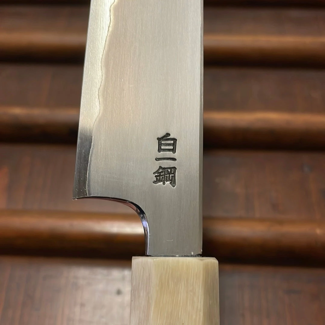 Hand made in Sakai, kasumi finish stainless clad shirogami 1 forged by dentoukougeishi master smith Kenji Togashi and expertly ground by his son. Stainless clad shirogami 1 is a less common combination as it is more challenging to work but it offers a great combination of the shirogami 1 carbon steel’s fine edge formation and long edge life with the stainless steel’s ease of use.