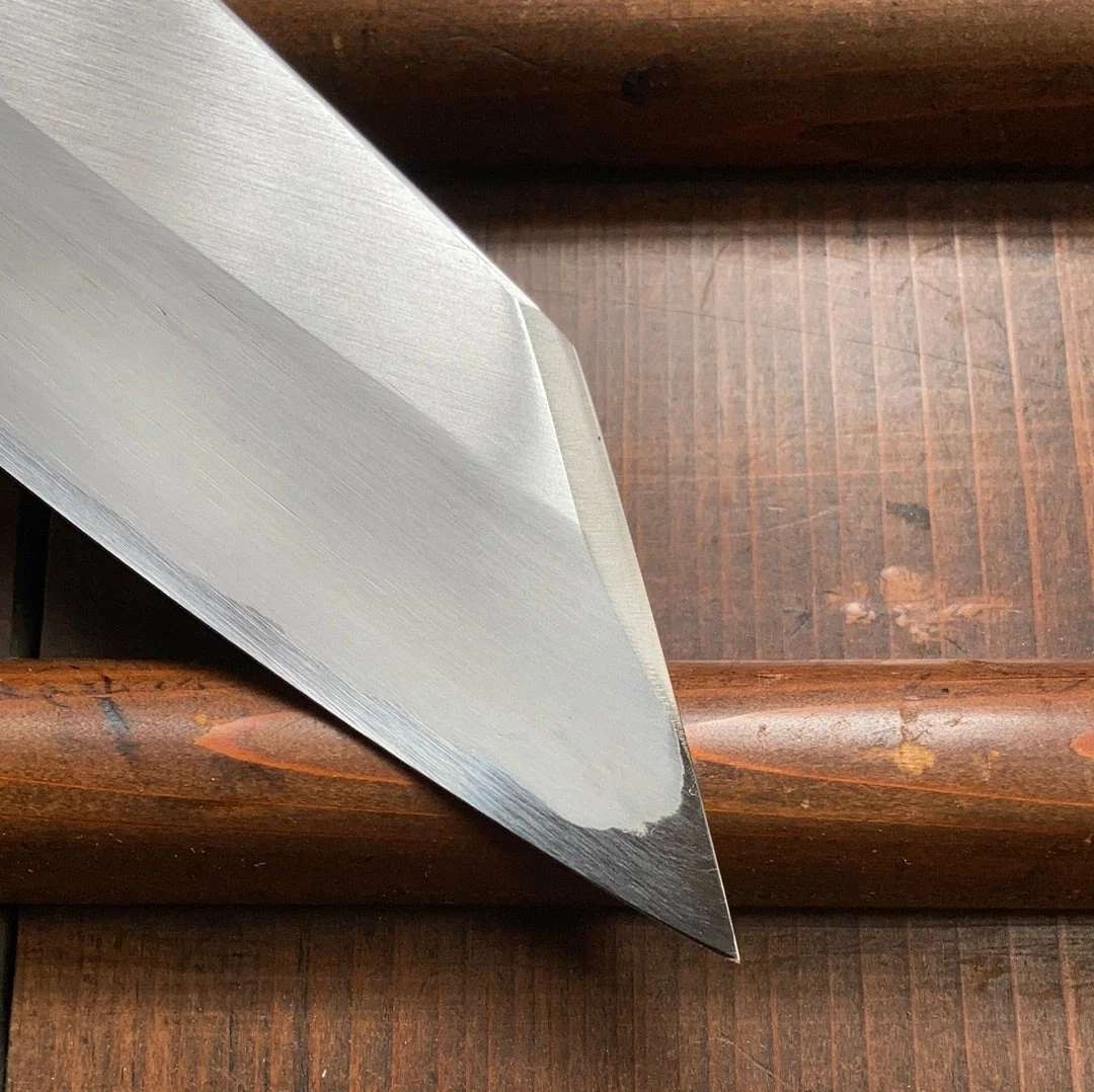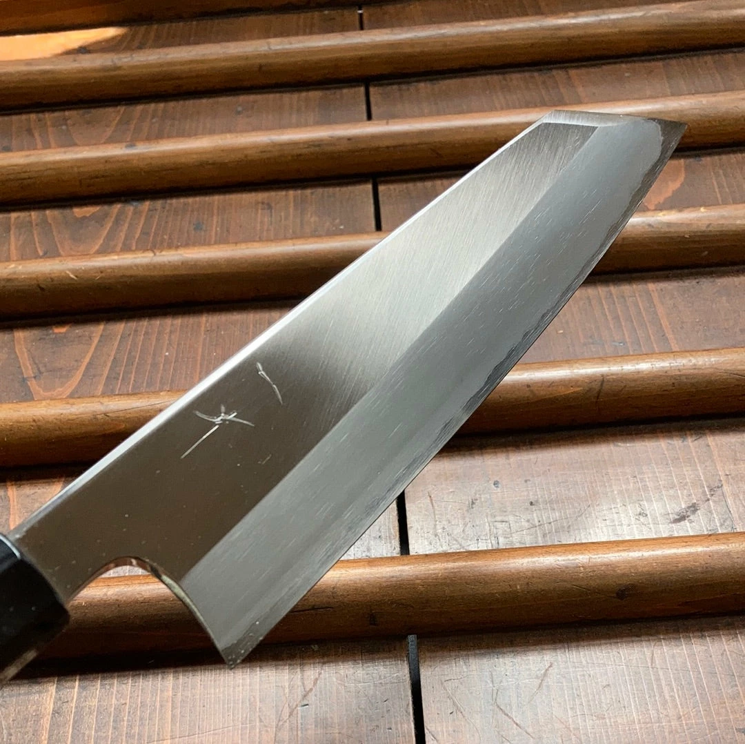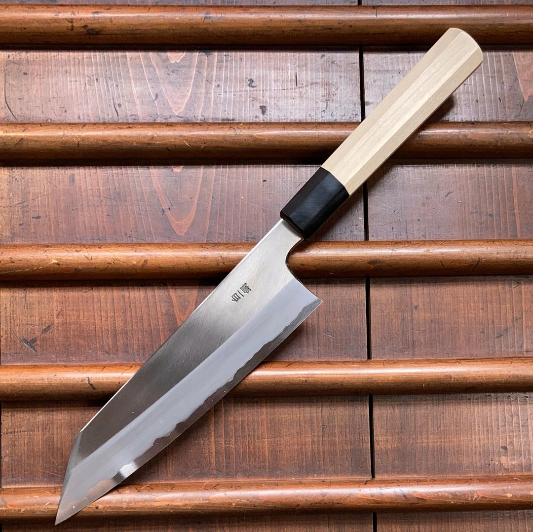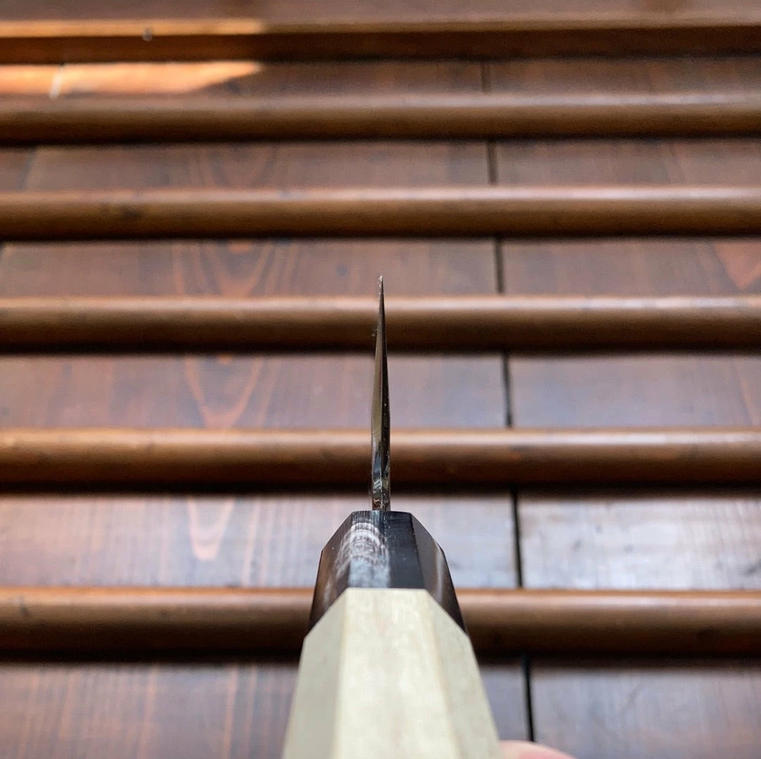 Hand made in Sakai, stainless clad shirogami 1 forged by dentoukougeishi master smith Kenji Togashi and expertly ground by his son. Stainless clad shirogami 1 is a less common combination as it is more challenging to work but it offers a great combination of the shirogami 1 carbon steel’s fine edge formation and long edge life with the stainless steel’s ease of use.