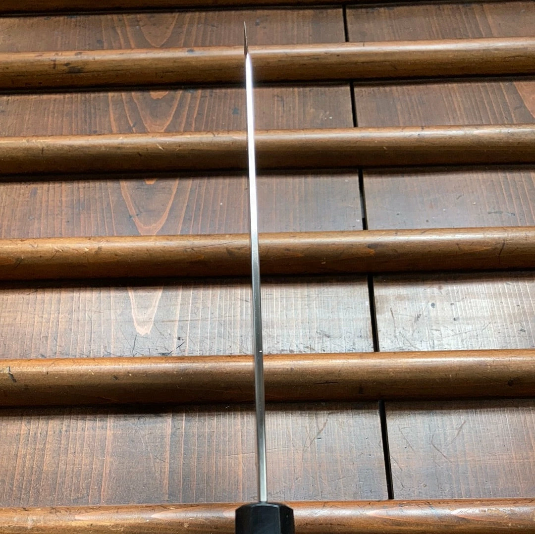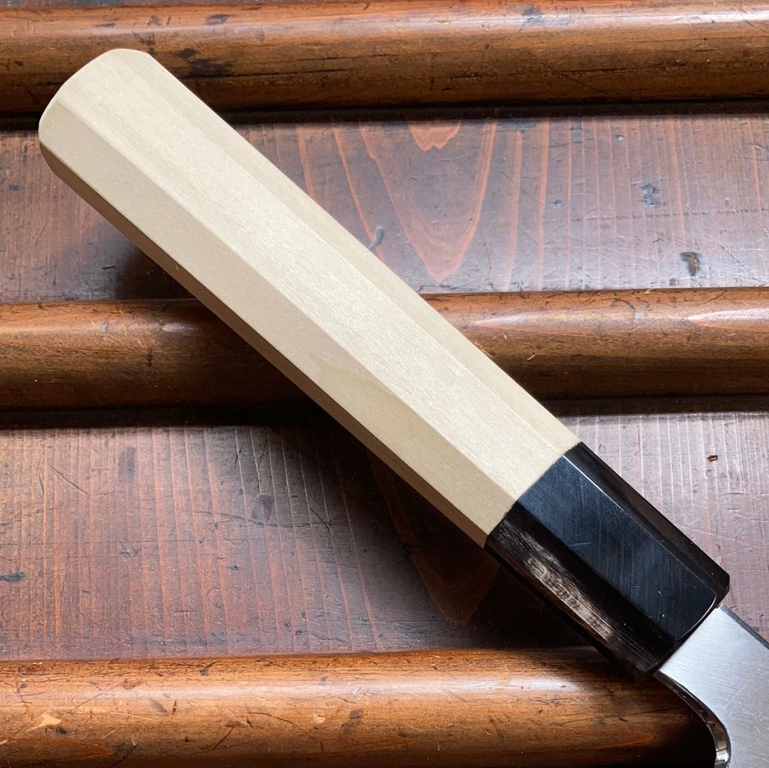 These are super easy to sharpen with a great cutting duration and smooth cutting feel with nicely finished corners. Slightly larger than usual geometry for a Sakai gyuto but still following in that style. Octagonal ho wood and horn handle shaves a little weight off and makes for a very secure grip even when wet or greasy.