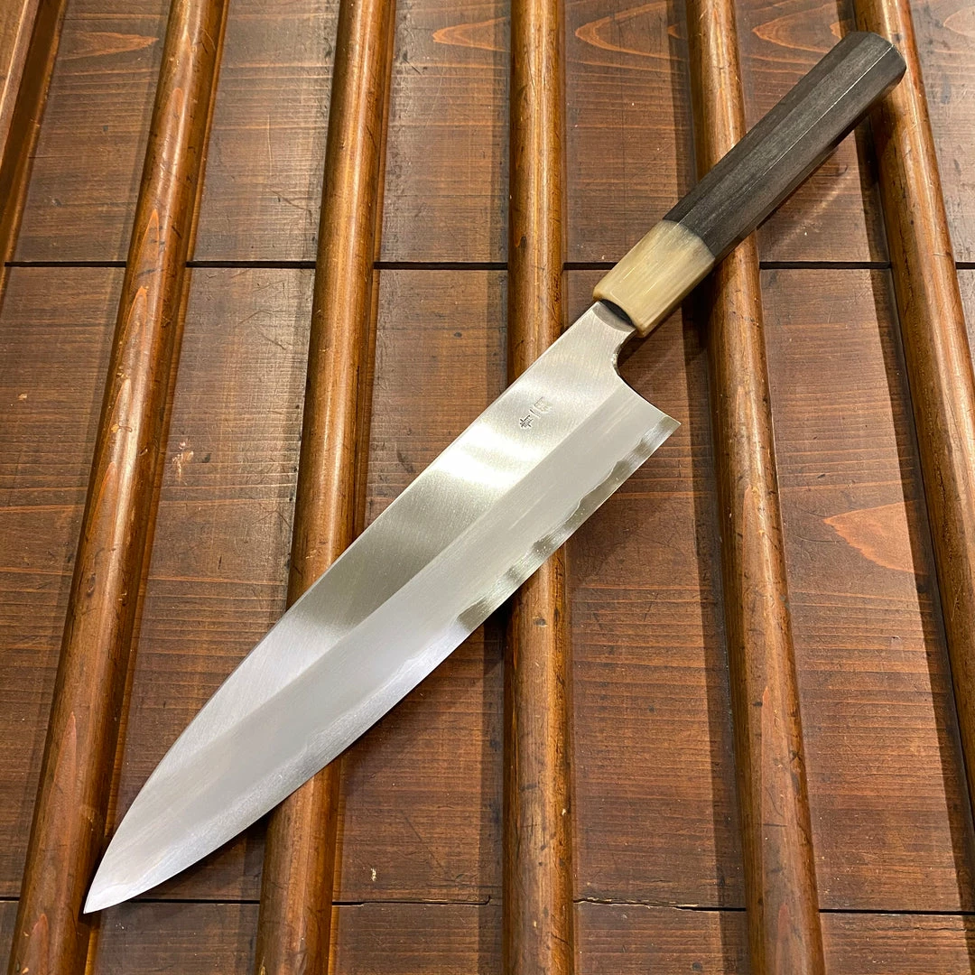 240mm Gyuto in Stainless Clad Aogami 1 with Ebony and horn handle.