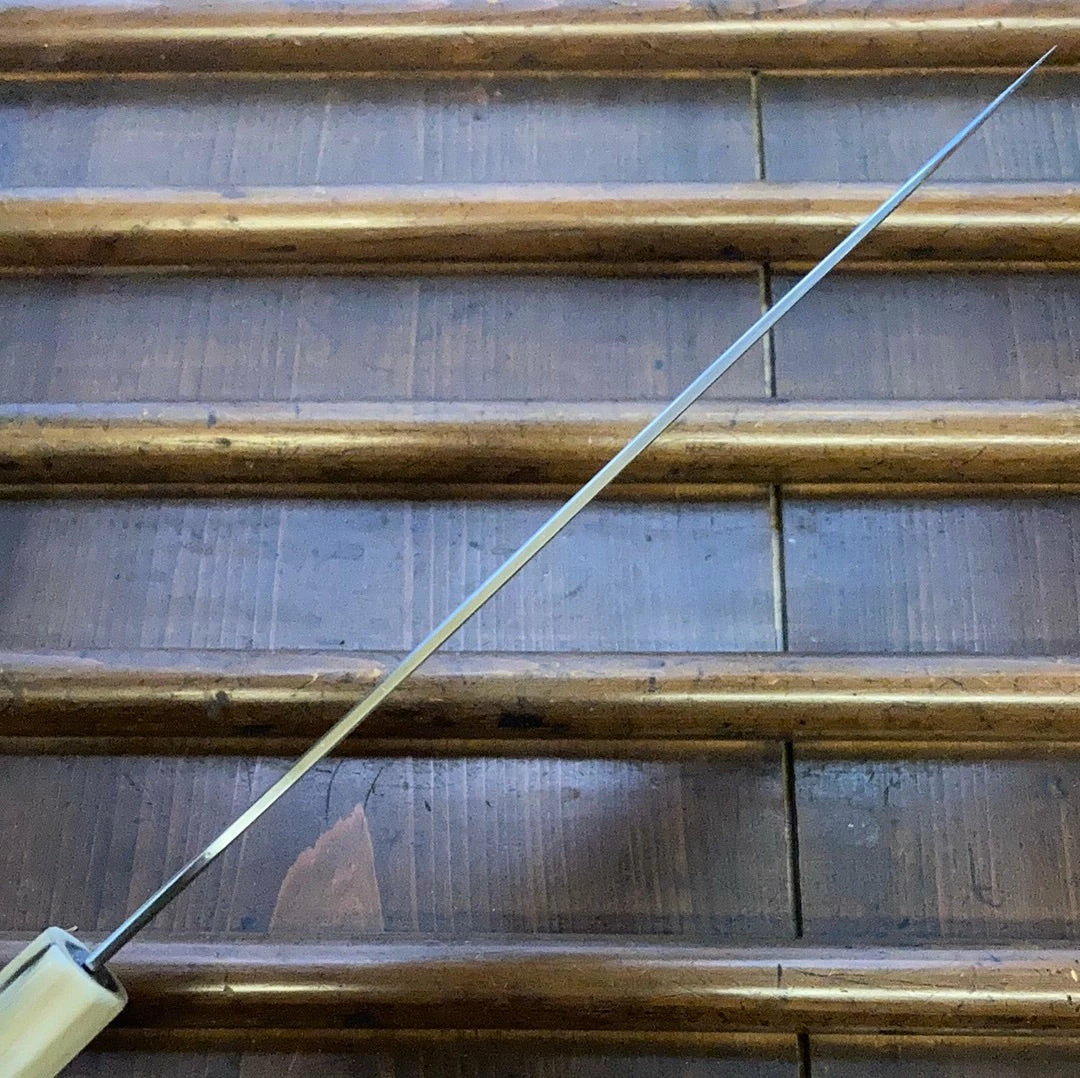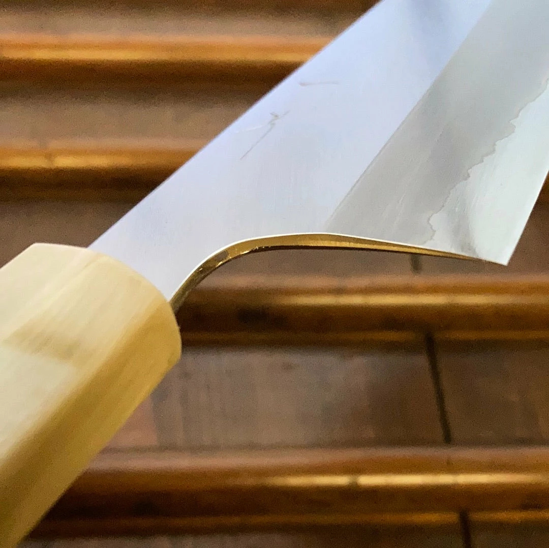 Hand made in Sakai, stainless clad shirogami 1 forged by dentoukougeishi master smith Kenji Togashi and expertly ground by his son. Stainless clad shirogami 1 is a less common combination as it is more challenging to work but it offers a great combination of the shirogami 1 carbon steel’s fine edge formation and long edge life with the stainless steel’s ease of use.