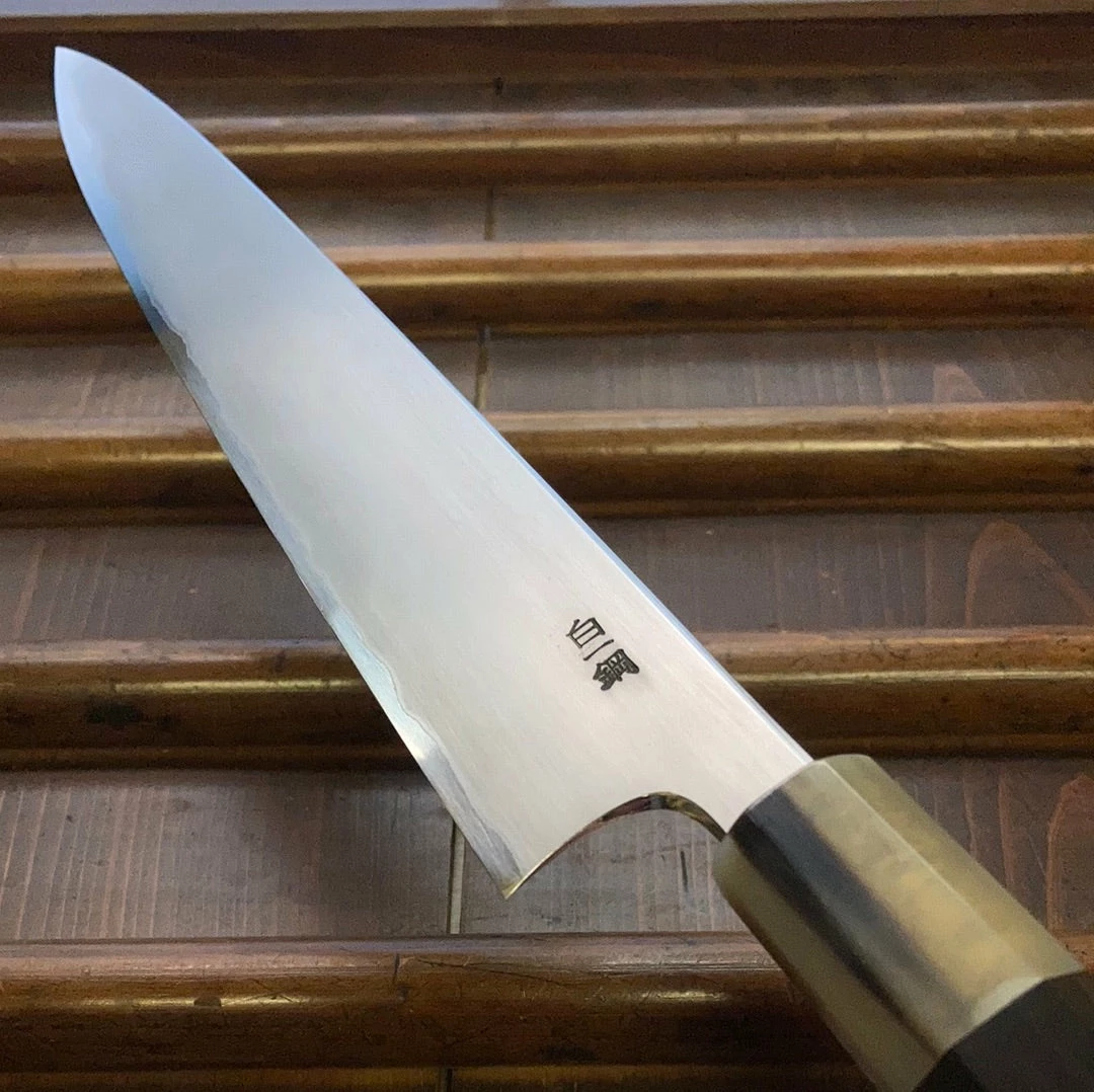 Hand made in Sakai, kasumi finish stainless clad shirogami 1 forged by dentoukougeishi master smith Kenji Togashi and expertly ground by his son. Stainless clad shirogami 1 is a less common combination as it is more challenging to work but it offers a great combination of the shirogami 1 carbon steel’s fine edge formation and long edge life with the stainless steel’s ease of use.
