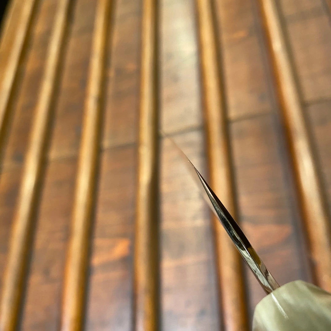 Hand made in Sakai, stainless clad shirogami 1 forged by dentoukougeishi master smith Kenji Togashi and expertly ground by his son. Stainless clad shirogami 1 is a less common combination as it is more challenging to work but it offers a great combination of the shirogami 1 carbon steel’s fine edge formation and long edge life with the stainless steel’s ease of use.