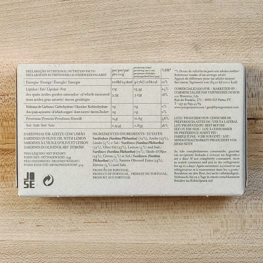“Atlantic and Mediterranean, our delicious sardines are kept fresh from the moment they are caught. They become even tastier and nutritionally rich with the lemon that flavors the olive oil. Savor this flavor with a bit of rustic bread or toasts, accompanied by a nice glass of white or red wine, someone to taste it with, or simply to please your ego!”