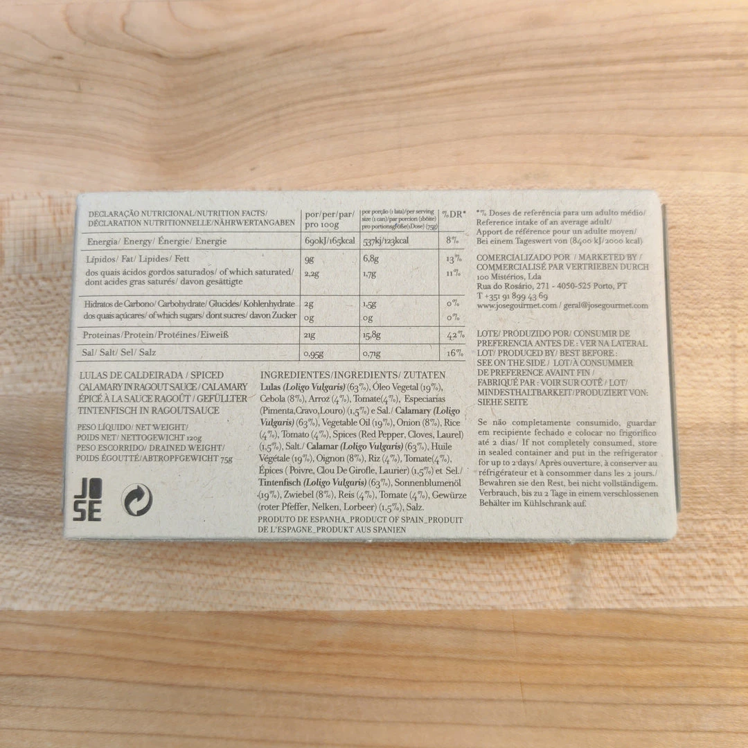 Ingredients: Calamari (63%), Vegetable Oil (19%), Onion (8%), Rice (4%), Tomato (4%), Spices (Red Pepper, Cloves, Laurel) (1,5%), Salt
