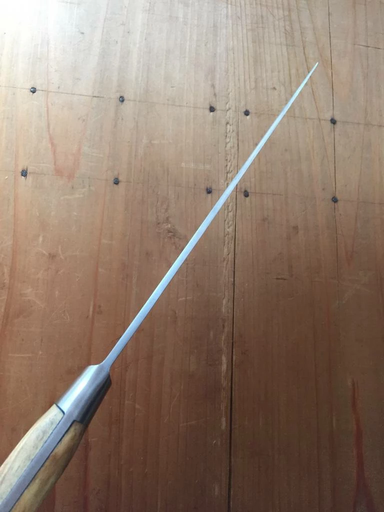 K Sabatier ‘Authentique’ series 9″ chef knife. XC75 carbon steel blade with riveted olive wood handle.