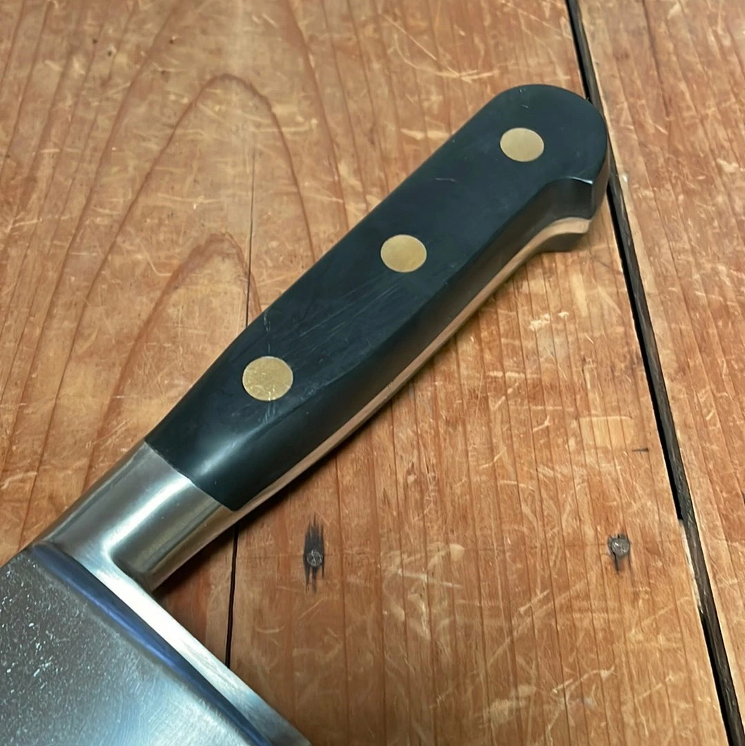 K Sabatier ‘Authentique’ series 12″ chef knife. XC75 carbon steel blade with riveted olive wood handle.