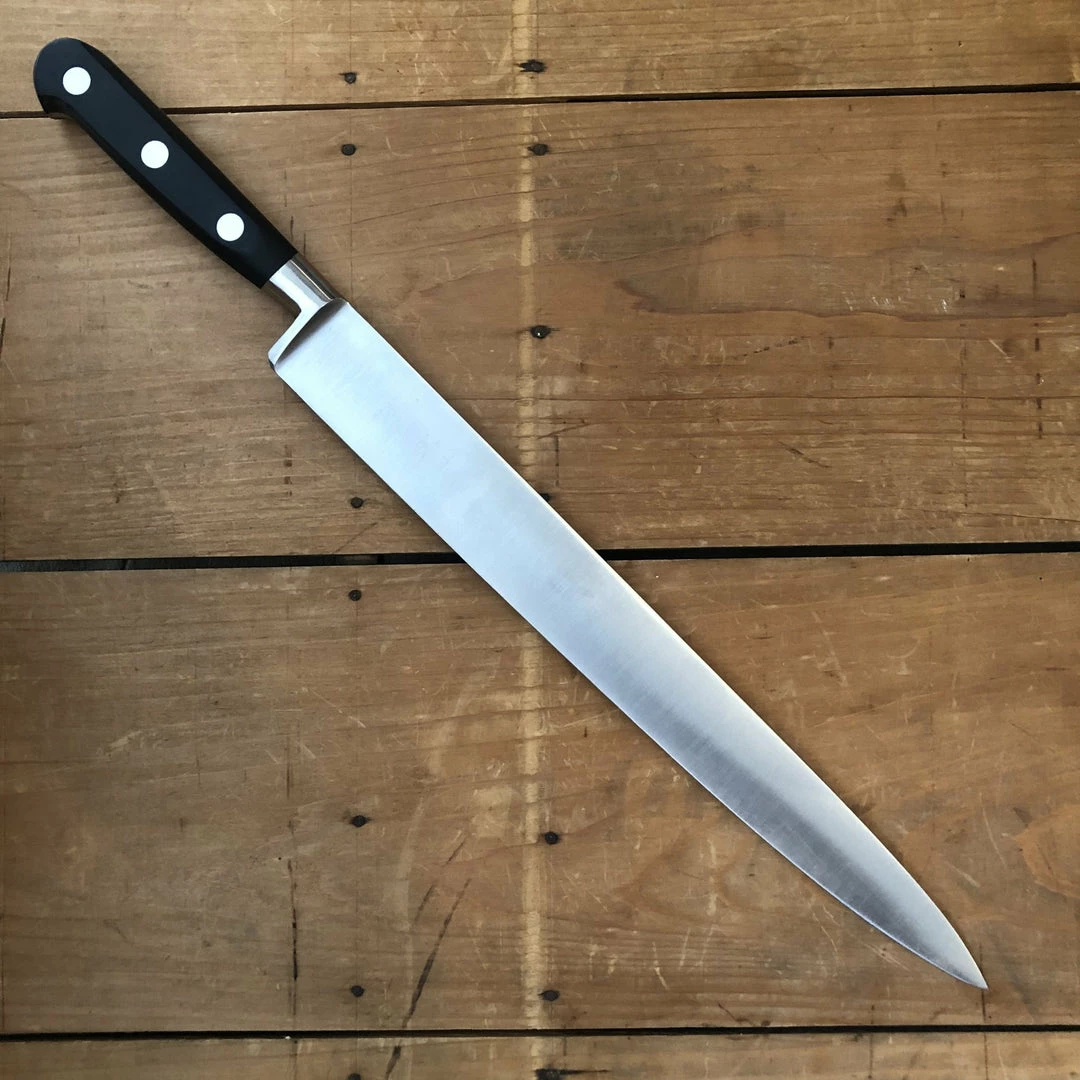 K Sabatier ‘Authentique’ series 12″ chef knife. Stainless steel blade with riveted black POM handle.