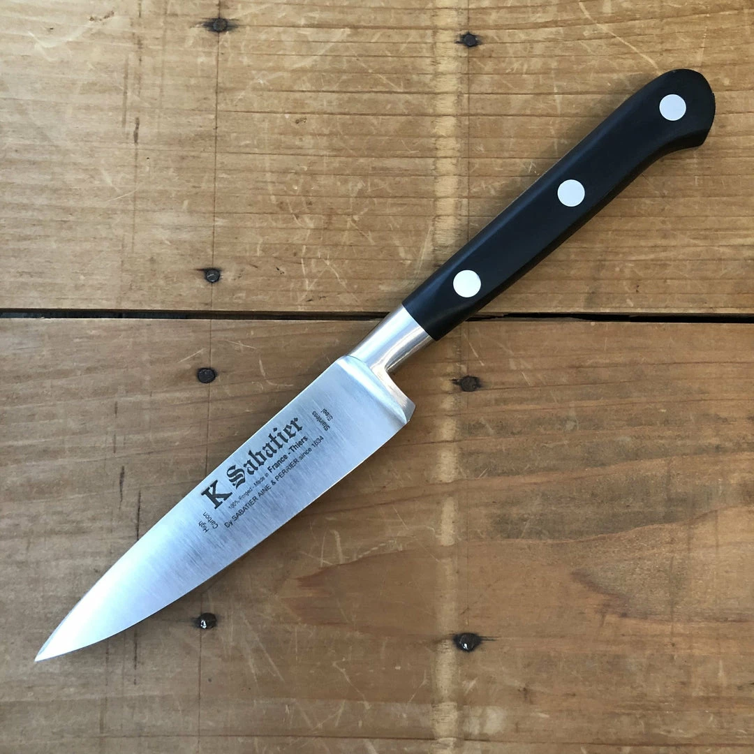 K Sabatier Authentique stainless series knives are forged from Z50C13 and tempered to 54-56 HRC; soft when compared to Japanese knives, but still with good edge life. These traditional style French stainless steel knives have a great toughness and are super easy to sharpen.
