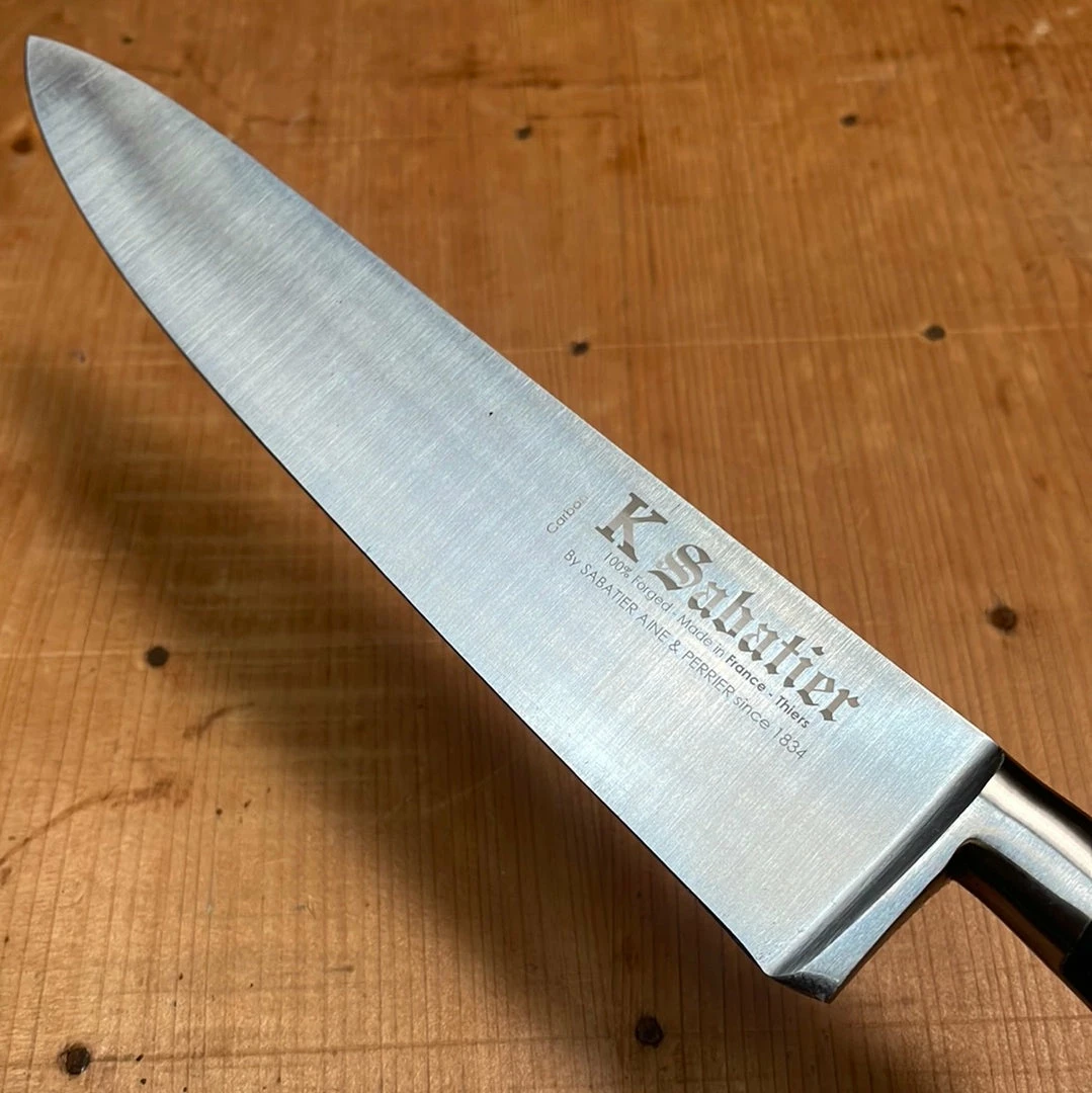 K Sabatierโs โAuthentique series carbon knives are drop forged from a single piece of XC75 and tempered to 54-56 HRC. They are ground extra thin behind the edge for awesome cutting feel, are easy to sharpen and have good toughness, a great all around workhorse. Carbon steel will develop a patina, and rust if left wet. Dry immediately after use, never soak or put in the dishwasher. Rust can be removed with a light abrasive.