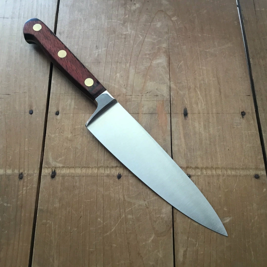 K Sabatier ‘Auvergne’ series 6″ chef knife. Forged stainless steel with red pakka wood handle and brass rivets.
