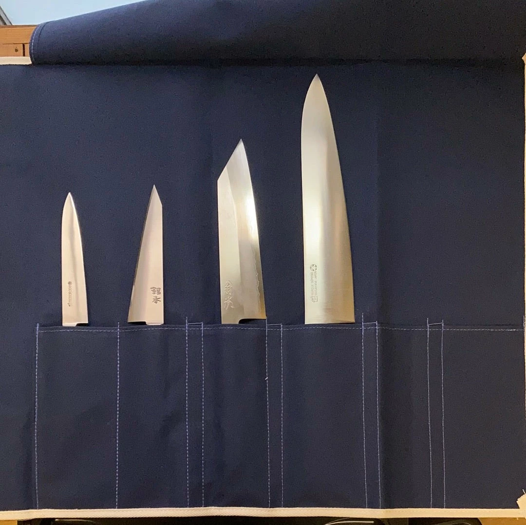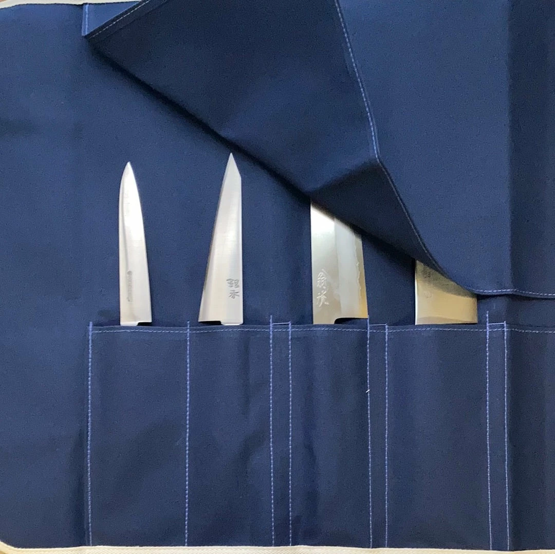 Medium canvas knife roll with hemmed edges. Six slots with cover flap and no tool pocket. Opens tall enough to fit up to 240mm knife with saya.