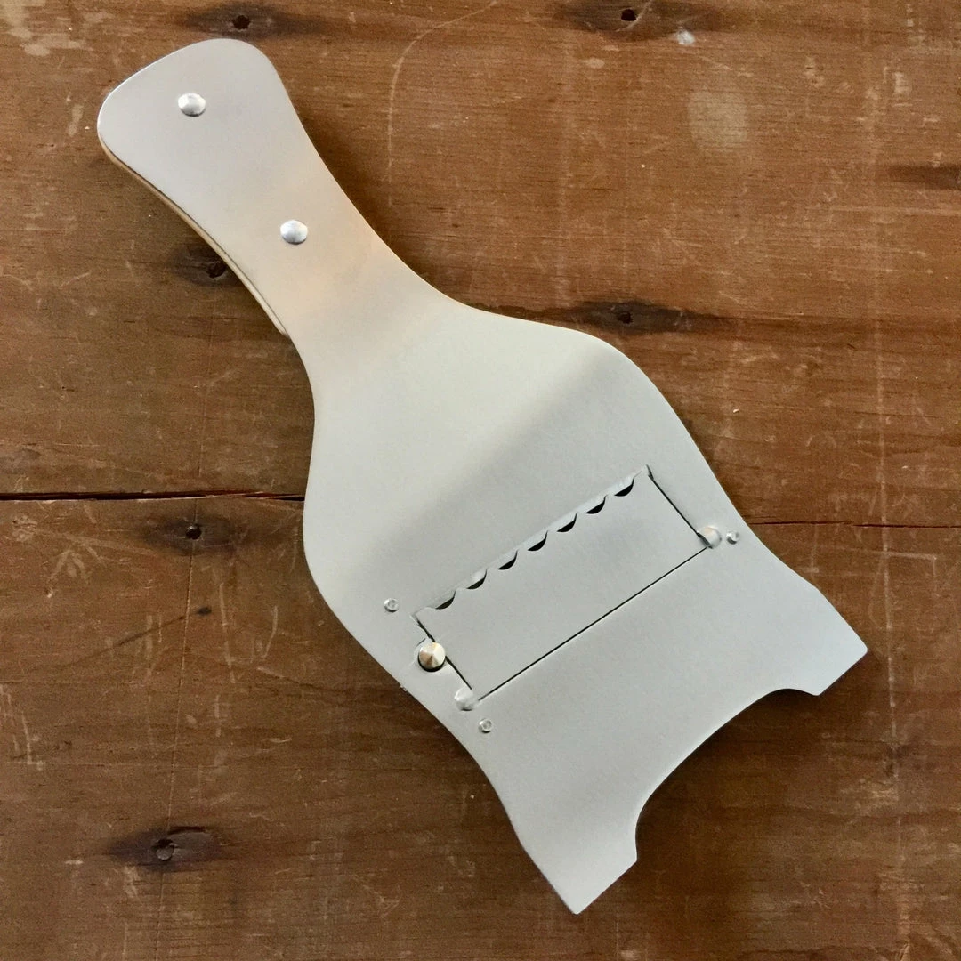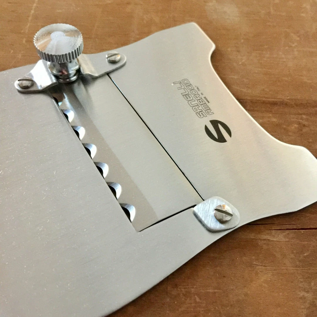 Stainless steel frame with wavey blade and olive wood handle. The adjustable blade allows for controlled shaving of truffles at different thicknesses.