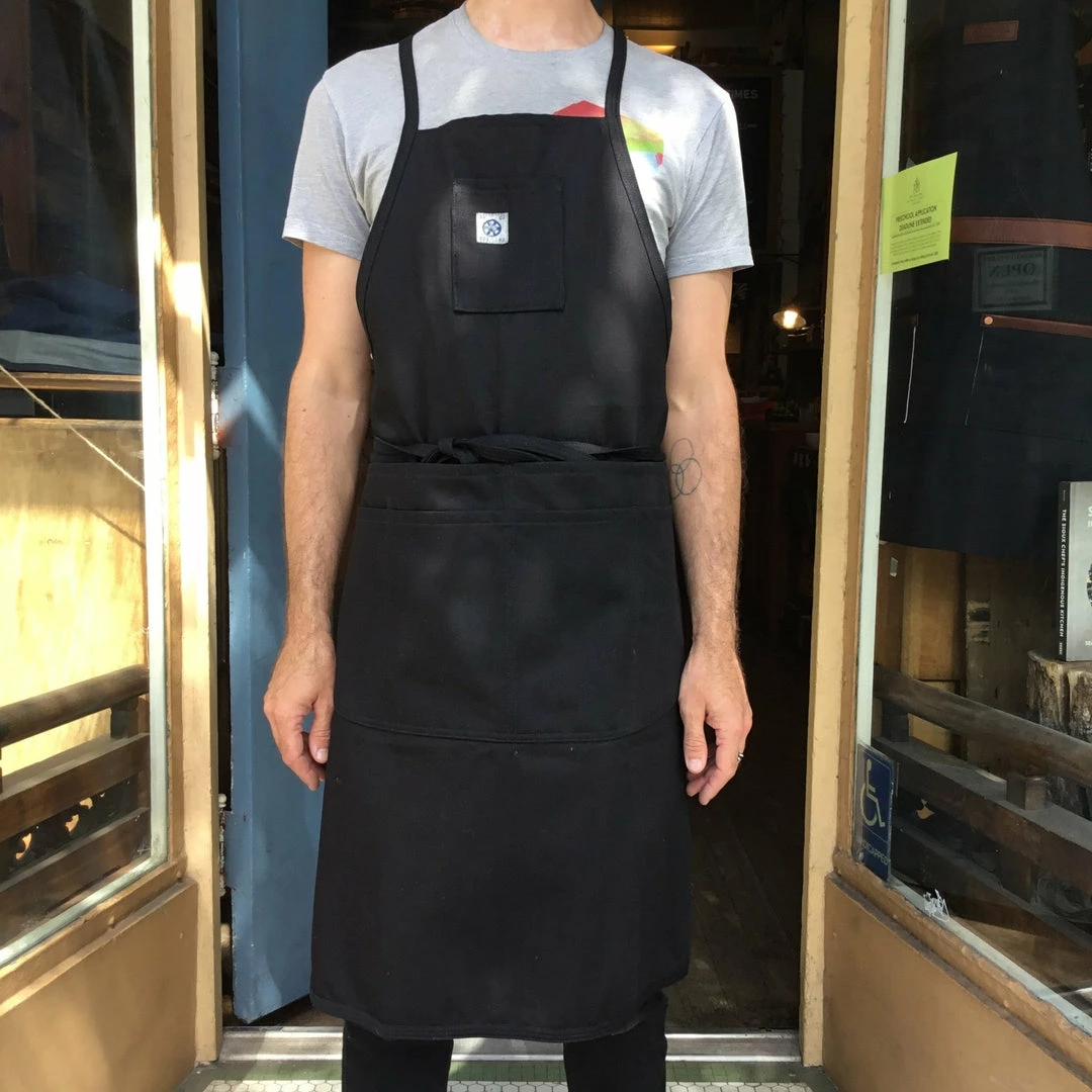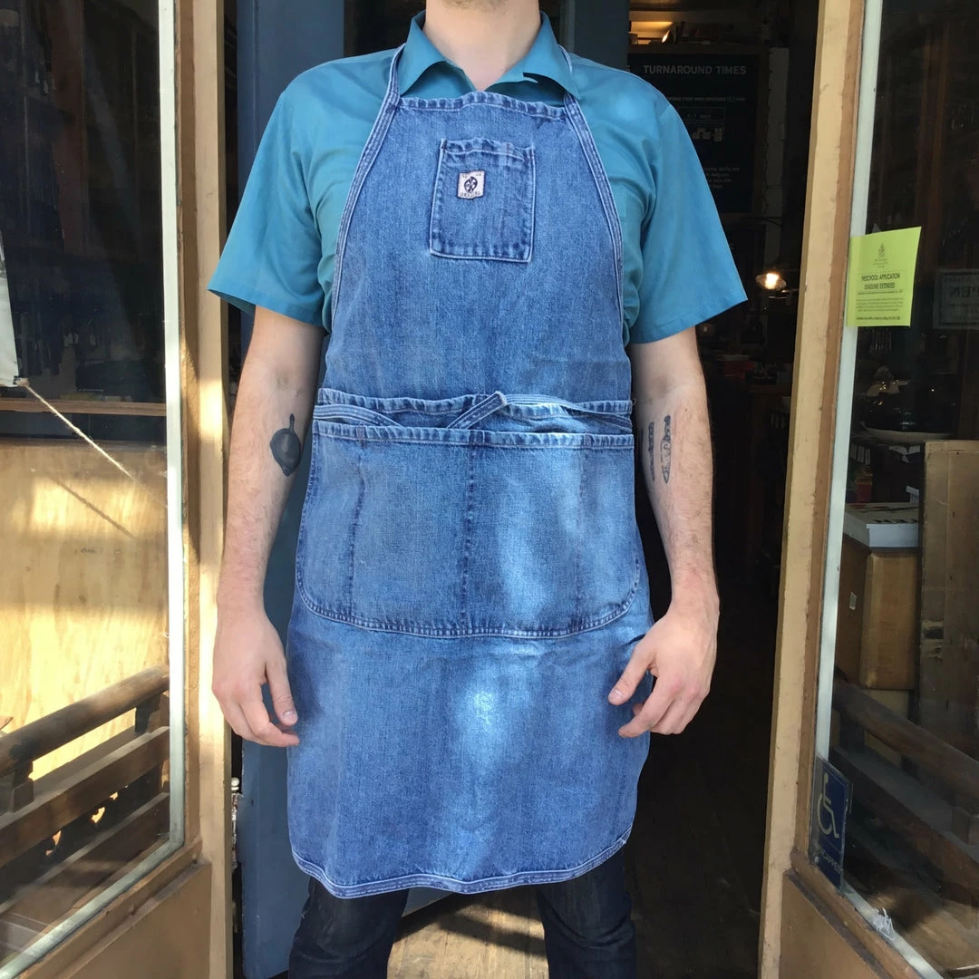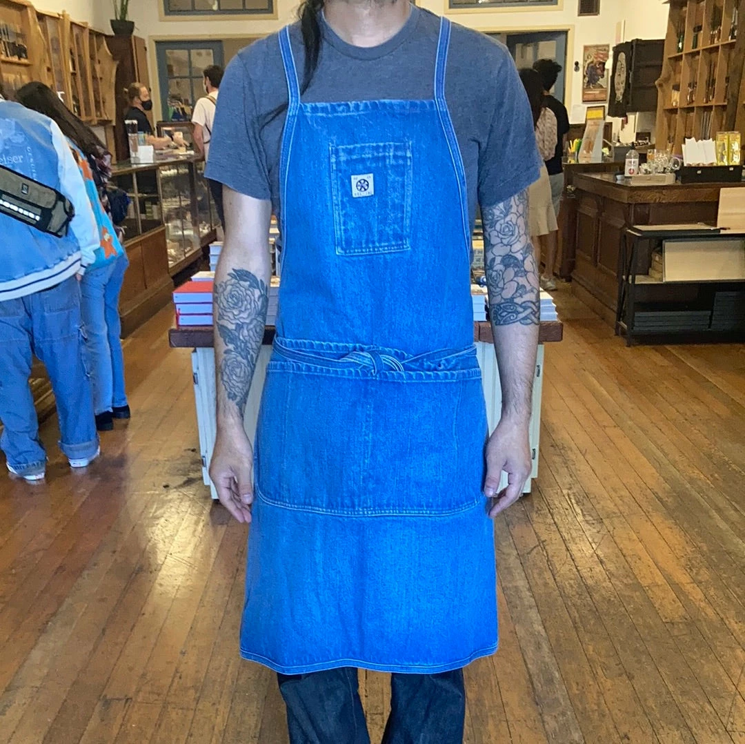 Ubi-IND / Mi Cocina Cross-back apron. Light indigo dyed denim. Cross back design sits comfortably without pulling on the neck and conforms to many body types. Machine washable.