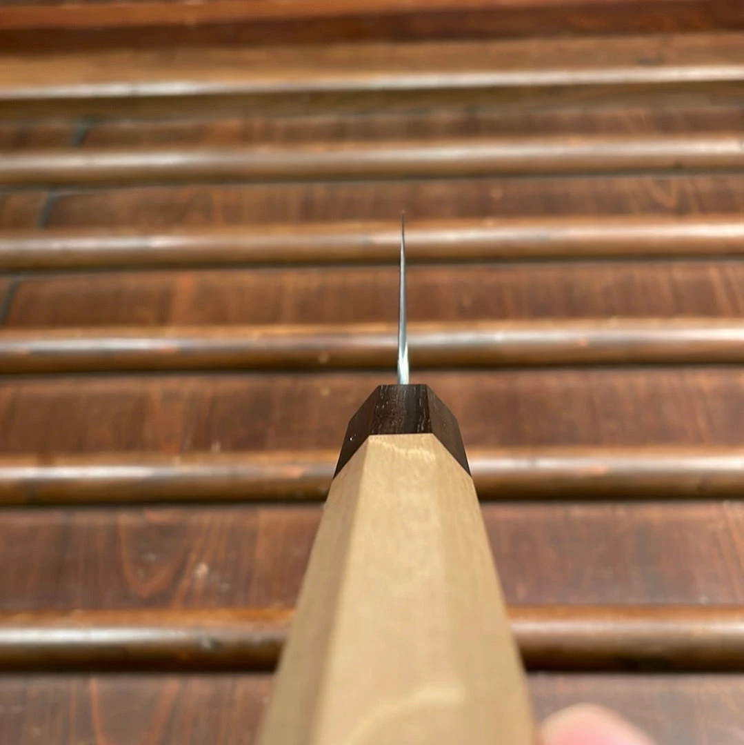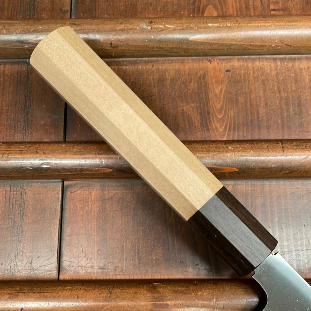 Konosuke Sakai ‘HD2’ 240mm Wa Gyuto knife. Semi stainless mono steel blade. Octagon ho wood (magnolia) handle with ebony wood ferrule. Saya cover is included.
