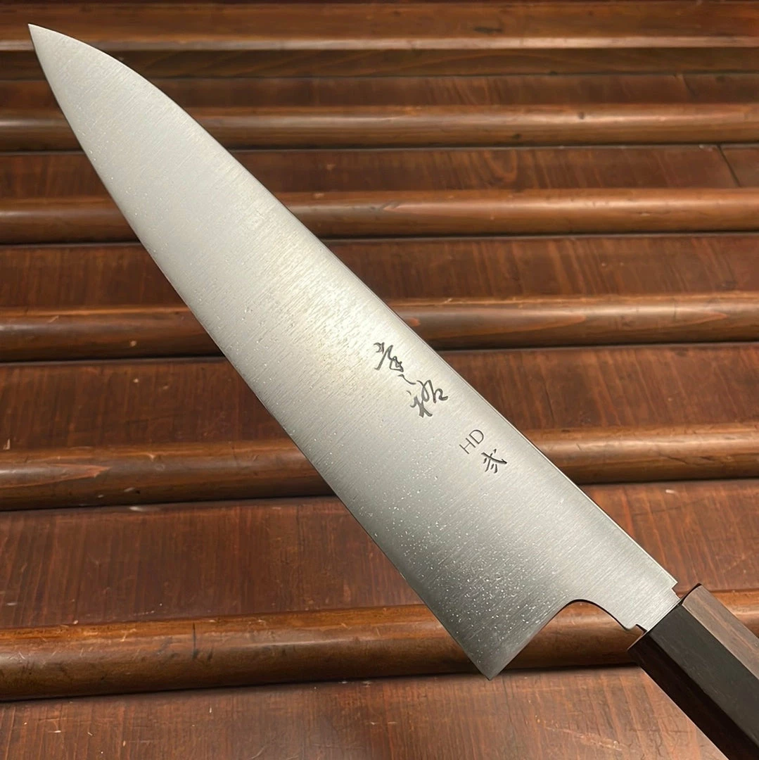 The legendary Konosuke HD2 series feature a mono-steel blade handmade in Sakai city, and feature some of the best thin grinds we have ever seen. These represent the best of both worlds of stainless and carbon steel; easy to sharpen with a good edge life and good cutting feel as they dull, and nearly stainless: they do not interact very much with reactive foods to influence flavor. Excellent hamaguri convex grinds and a top tier heat treatment make these a favorite, we are really happy to have them available.