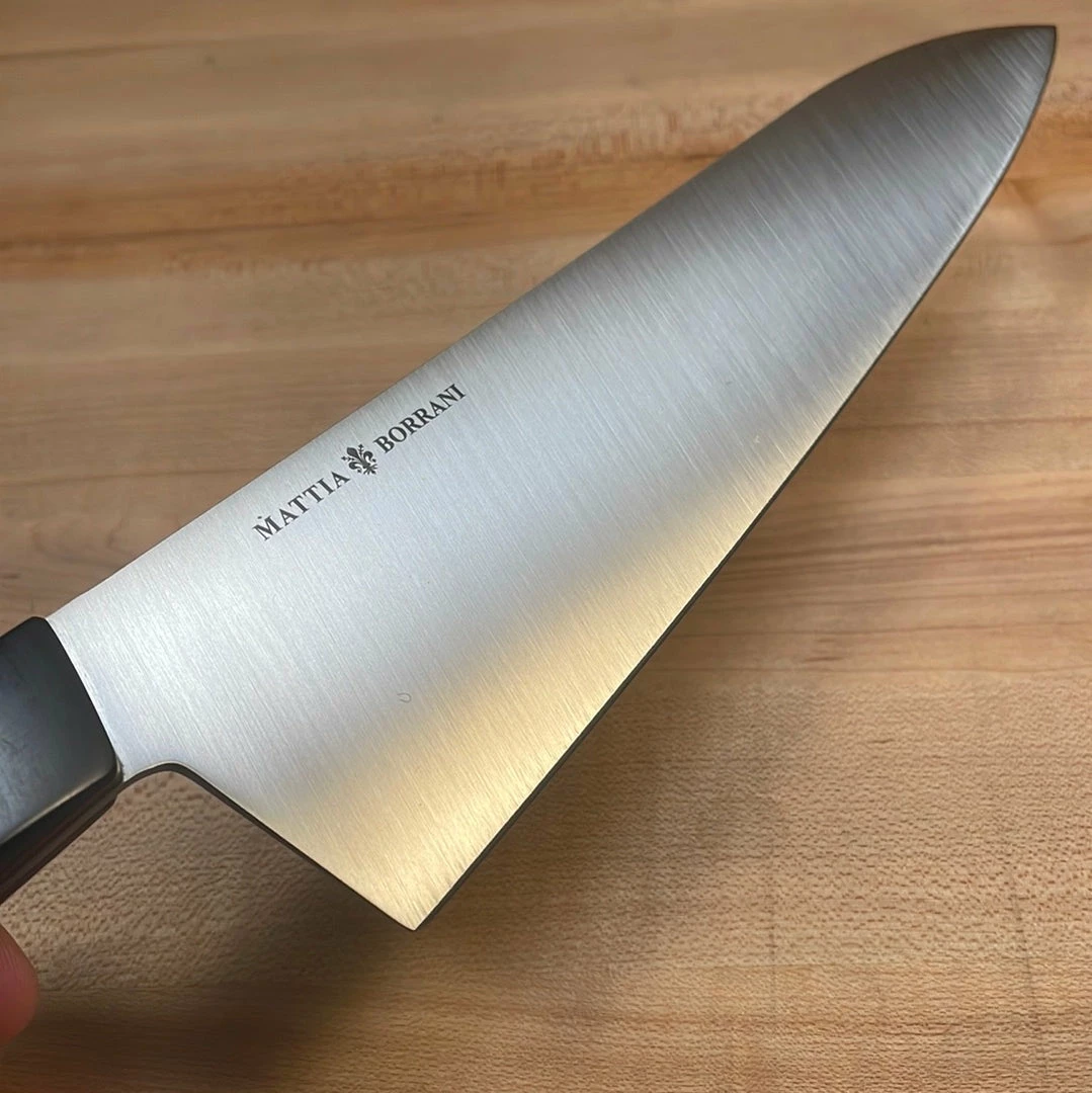 Mattia Borrani knives are made in Petaluma, California just north of San Francisco. He is co-owner of Begg knives famous for their high-end custom folding knives. His kitchen cutlery line is born from a love of cooking, having spent years as a cook in a former life. They are ground thin, satin finished and are using unique patterned micarta in the handles that are made in Sacramento by Gregg Hansen.