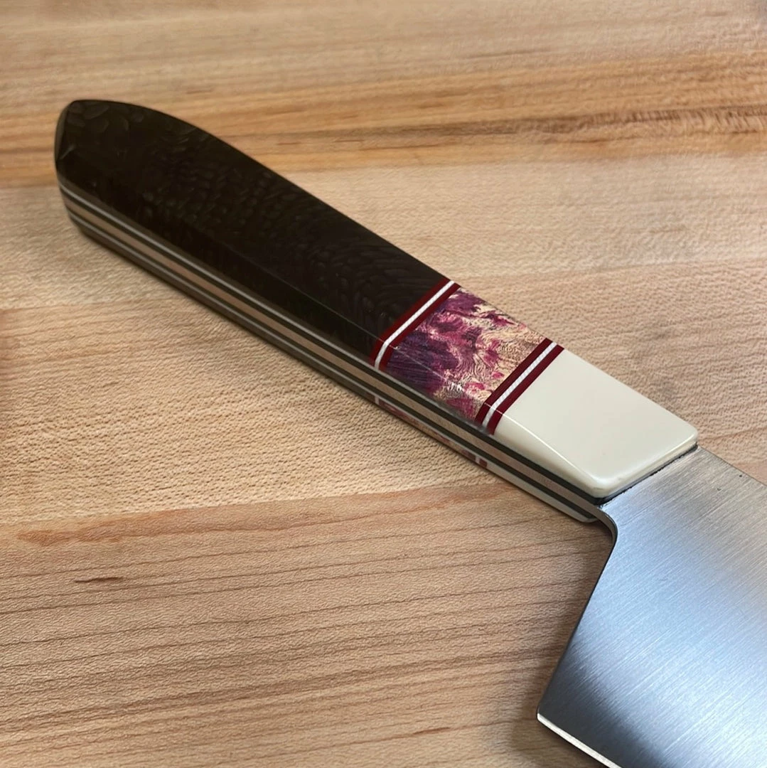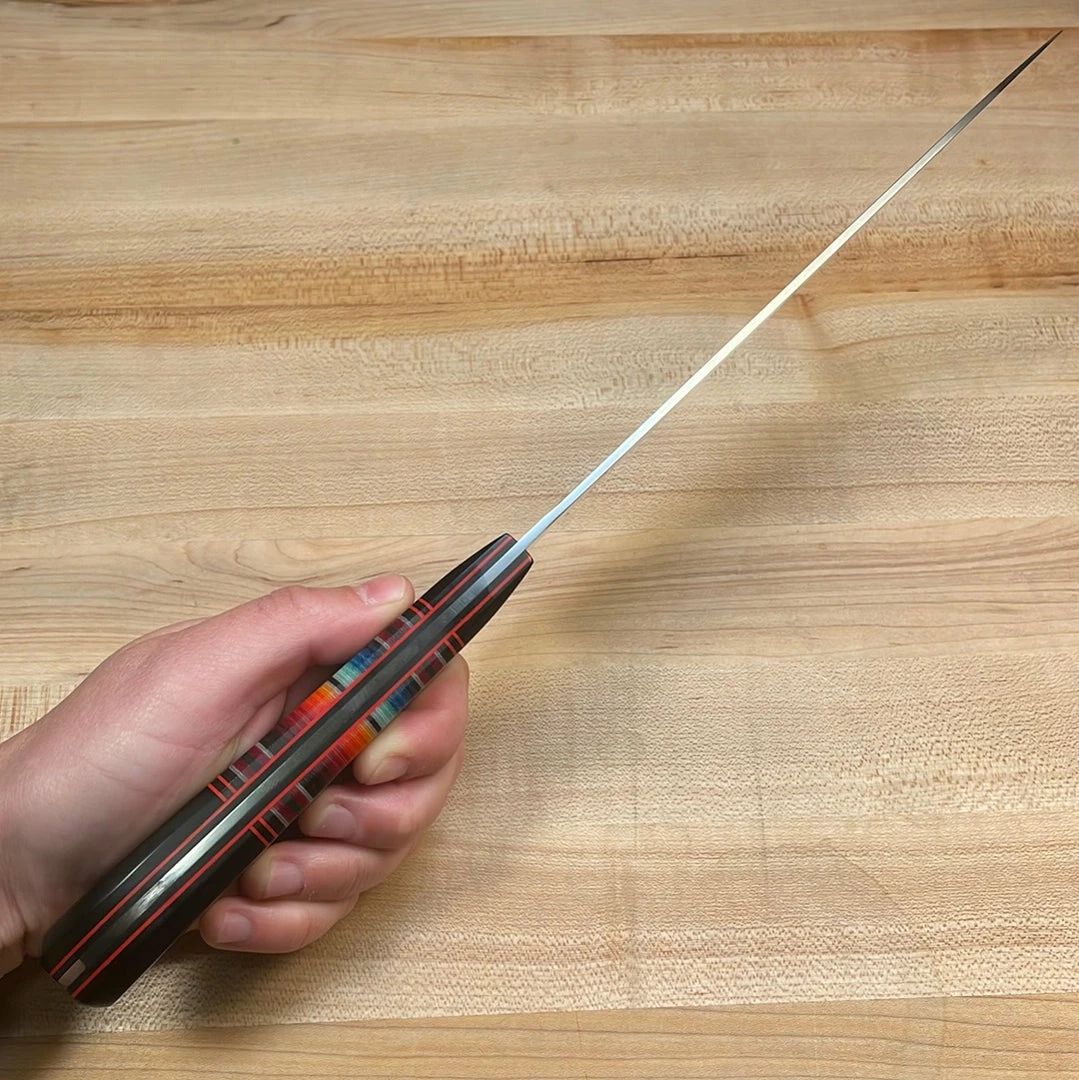 Here is our twist on the classic Gyuto, the Japanese version of a Western chef’s knife. Employing full tang construction but slightly thinner (.085″) than the traditional Western chef’s knife, it is a perfect multipurpose knife for slicing vegetables and proteins as well as using the heal for chopping or push cutting. Featuring excellent geometry, full distal taper, and convex bevel for outstanding performance and food release. When using push and pull cuts, the Gyuto is perfect for use on a variety of proteins because of its thin and sharper edge.