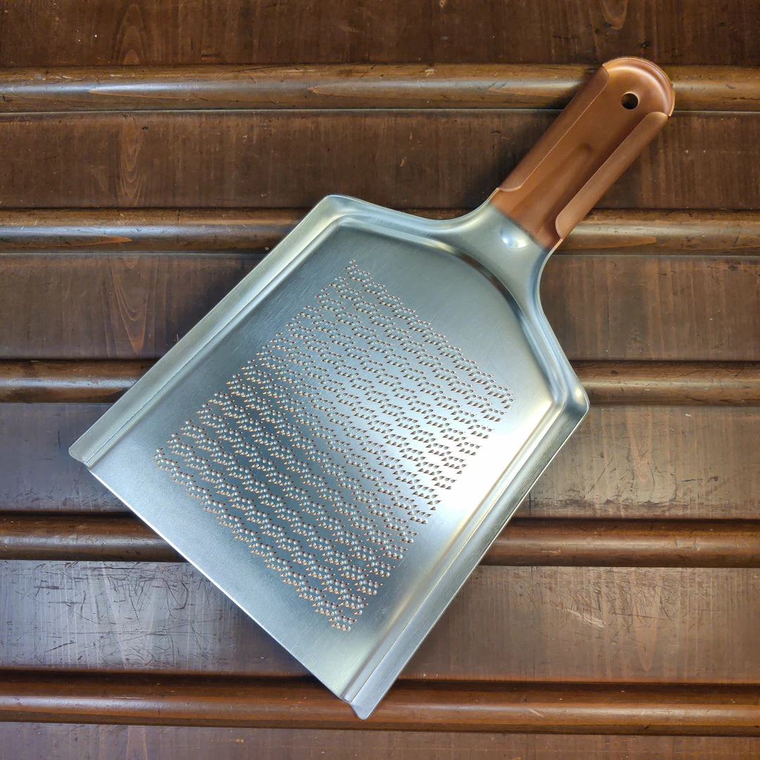 This is the Big Dog of oroshigane! It’s both tough and elegant; popular among professionals and serious home cooks. The handle allows for a secure and comfortable grip for heavy work and large-scale production. The double-sided grater provides both a fine and coarse cut. This modern stainless steel tooth design cuts longer than the older styles. This oroshigane can be used to create a pulpy paste of many different foods, such as daikon, carrots, and ginger.