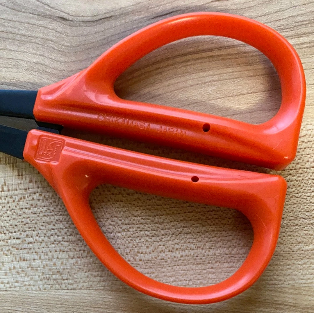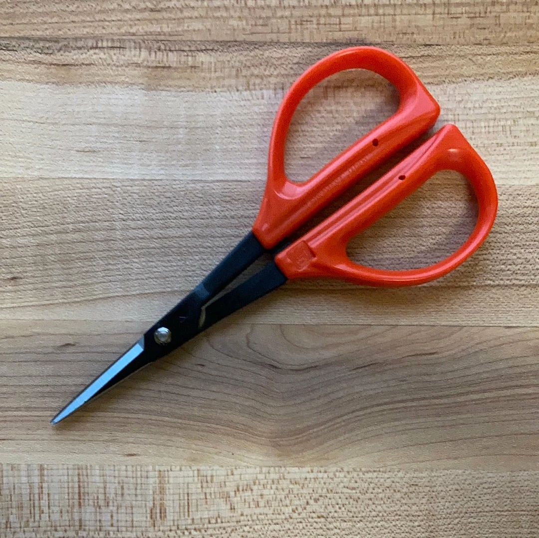 A fine tipped carbon steel shear, nimble, precise and holds an edge well, can be re-sharpened. Excellent for herb work, and general gardening and kitchen tasks.