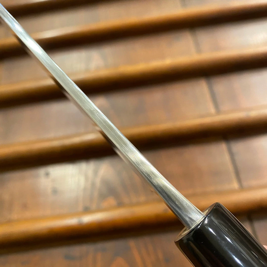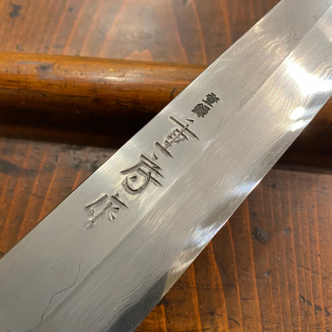Hand made in Sanjo Niigata by the Iizuka family brand Shigefusa. Free forged โkitaejiโ suminagashi iron and mild steel clad ‘spicy’ Swedish carbon steel with horn ferruled ho wood handle. Comes with saya and wood box