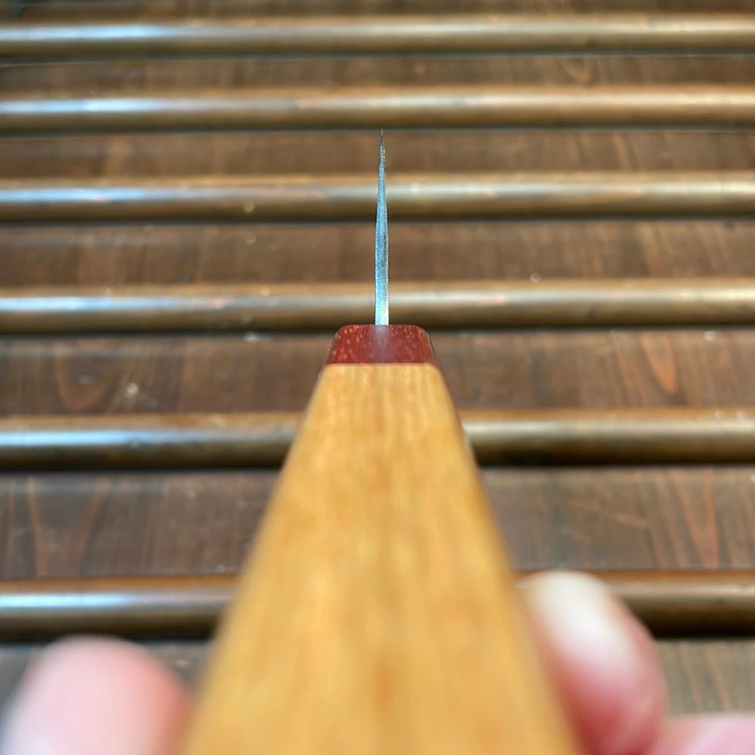 These are forged in stainless clad shirogami 2 with a mIgaki matte polishedย finish, they have the classic Sanjo geometry with strong distal taper and a square leaning oak andย bubinga octagonal handle, also made in Sanjo specifically for this series.