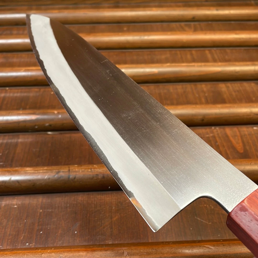 These are forged in stainless clad shirogami 2 with a mIgaki matte polished finish, they have the classic Sanjo geometry with strong distal taper and a square leaning oak and wenge octagonal handle, also made in Sanjo specifically for this series.