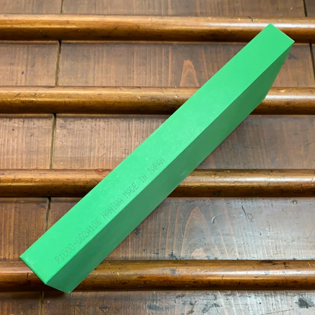 This 1000 stone is faster than the shallow scratches would suggest, it is an excellent stone for either maintaining slightly dull knives or for removing the scratches from a coarser stone like the Naniwa 400 stone when a knife needs more thorough edge re-shaping. When working on wide beveled knives this stone provides a surface that is easy to polish.